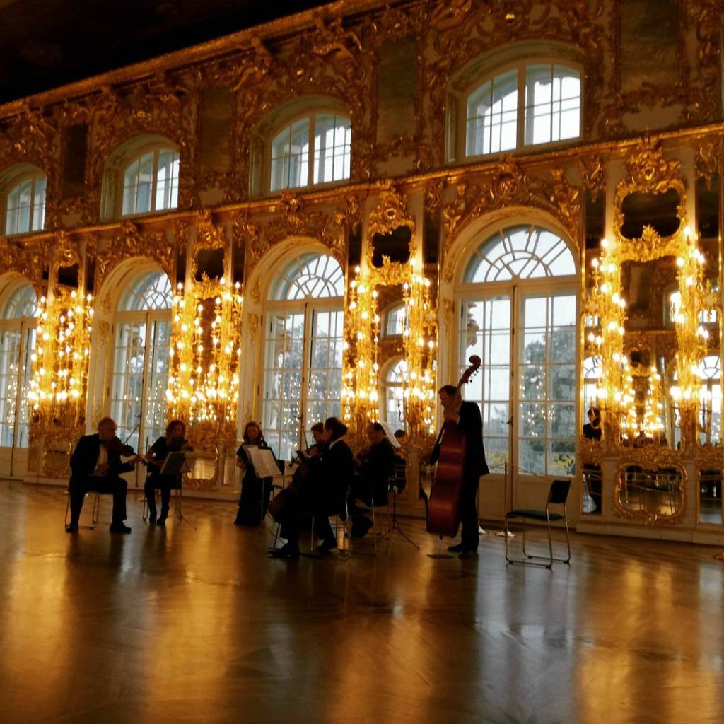 Eines der Highlights der Ostsee Reise mit der Mein Schiff 6 nach Danzig mit Baltikum und St. Petersburg ist sicherlich der Abendliche Empfang im Katharinenpalast. Hierfür bietet TUI Mein Schiff einen exklusiven Ausflug nach den regulären Öffnungszeiten. Abends nach 19 Uhr, dürfen nur Gäste der TUI Flotte in den Katharinenpalast. Fürstlich werden wir empfangen von einer Marschkapelle. Wir laufen auf sie zu und sie geben uns das Gefühl, als ob wir Mitglieder einer Delegation bei einem Staatempfang wären. Einige stehen auch Parade und verziehen keine Miene. Danach geht es in den leeren Katharinenpalast, wo man sonst nur durchgeschoben wird und sobald man zwei Minuten in einem Raum verharrt, ertönt, wie auch im Peterhof, ein Ton, dass man bitte weiter gehen soll. Diesen Stress haben wir nicht, denn der Katharinenpalast ist exklusiv nur für uns geöffnet. Nachdem wir braune Pantoffeln aus Stoff als Überzieher für unsere Schuhe bekommen haben, um das jahrhundertealte Parkett zu schonen, dürfen wir in den Prunk eintauchen. So viel Gold haben wir in unserem Leben noch nicht gesehen! Ein Oboeist spielt extra für uns in den leeren Residenzräumen und gibt uns ein annäherndes Gefühl vom damaligen Leben zu Hofe. Dadurch, dass wir allein im Palast residieren, haben wir die Möglichkeit, Fotos nur mit uns allein für die Ewigkeit zu schießen, anstatt mit 2000 anderen Besuchern. Somit sehen wir eine wunderbare menschenleere Flucht durch alle Räume. Der ein oder andere Kenner wird sagen „Moment mal. Warum fotografieren die im Katharinenpalast? Das ist doch verboten.“. Stimmt genau, aber eben nur tagsüber. Auf unserem exklusiven Abendlichen Empfang haben wir sogar eine Fotoerlaubnis und die gilt auch für das Bernsteinzimmer! Als Geschenk des preußischen Königs Friedrich Wilhelm I. an den russische Zaren Peter, zog es aus seinem ursprünglichen Domizil dem Berliner Stadtschloss in den Winterpalast in Russland. Nachdem das Bernsteinzimmer von 55m2 auf 98m2 von Elisabeth I. vergrößert wurde, zog es vom Winterpalast in den Katharinenpalast und wurde dort ausgestellt. Nach den Wirren des zweiten Weltkrieges gilt es als verschollen und ein Nachbau ist seit 2003 im Katharinenpalast wiederaufgebaut.