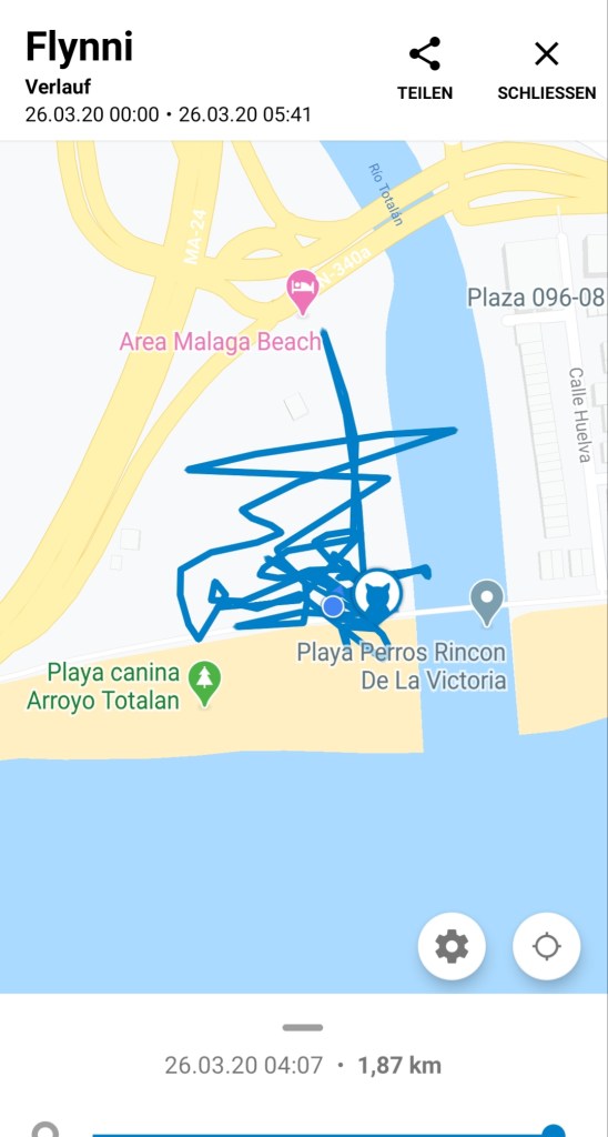 Ich habe Vertrauen, oder muss Vertrauen haben, dass er immer zu mir zurückkommt. Ich habe aber auch Vertrauen in die Technik, nämlich ins GPS. Ohne das darf er nicht raus. Ich würde mir ja wünschen, dass er rauskommt und ich mit ihm Gassi gehen kann. Aber dafür sind ihm, glaube ich, zu viele Hunde (inklusive Nachbarshund Mozart) unterwegs. Ich würde ihn ja auch alibimäßig gern mal mit an den Strand nehmen, dann hätte ich nämlich eine Berechtigung am Strand zu sein. Aber da ist er dann wieder total ängstlich.