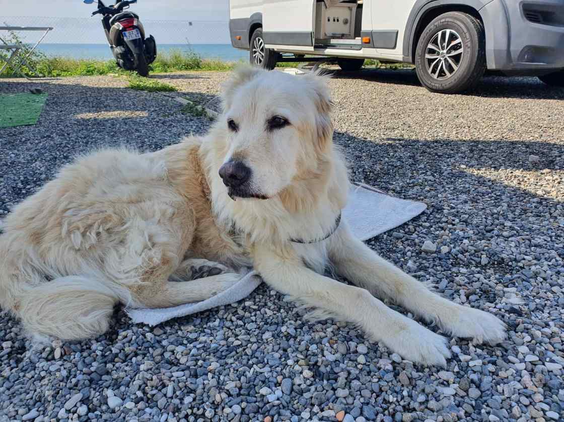 Wir dürfen ja mit unseren Wohnmobilen im Moment in der strengen Situation in Spanien nicht herausfahren. Aber es war in dem Fall ein medizinischer Notfall, somit durfte der Veterinärmediziner hereinkommen.