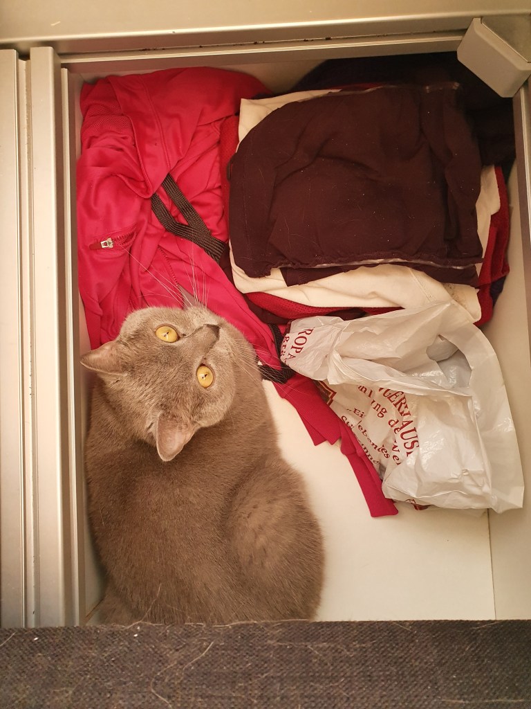 Flynn is much better off. In general he has constant access to his food and water, because I found a feeding bowl on rubber feet, so that his food can even stop while driving. I always have his cat toilet in the passenger’s foot space anyway, so the furry nose can be used for little King Tigers even while driving. I have always wondered, if I put him into the transport in Hamburg for example, then I can’t warn him before and tell him: „Please go to the toilet“ and suddenly we drive for 5 hour and he holds out. Cats can really hold out for a long time. Fortunately he doesn’t have to anymore. In the van I don’t put him in a transport basket anymore. Cats choose their own place to sleep and so he quickly chose a box with my clothes in it. I always push the lid a little to the side so that it doesn’t fall during the drive and Flynn has a nice dark cave. Fun fact besides, this box is pretty much the size of a transport basket, so it is integrated into the car like a dog kennel.