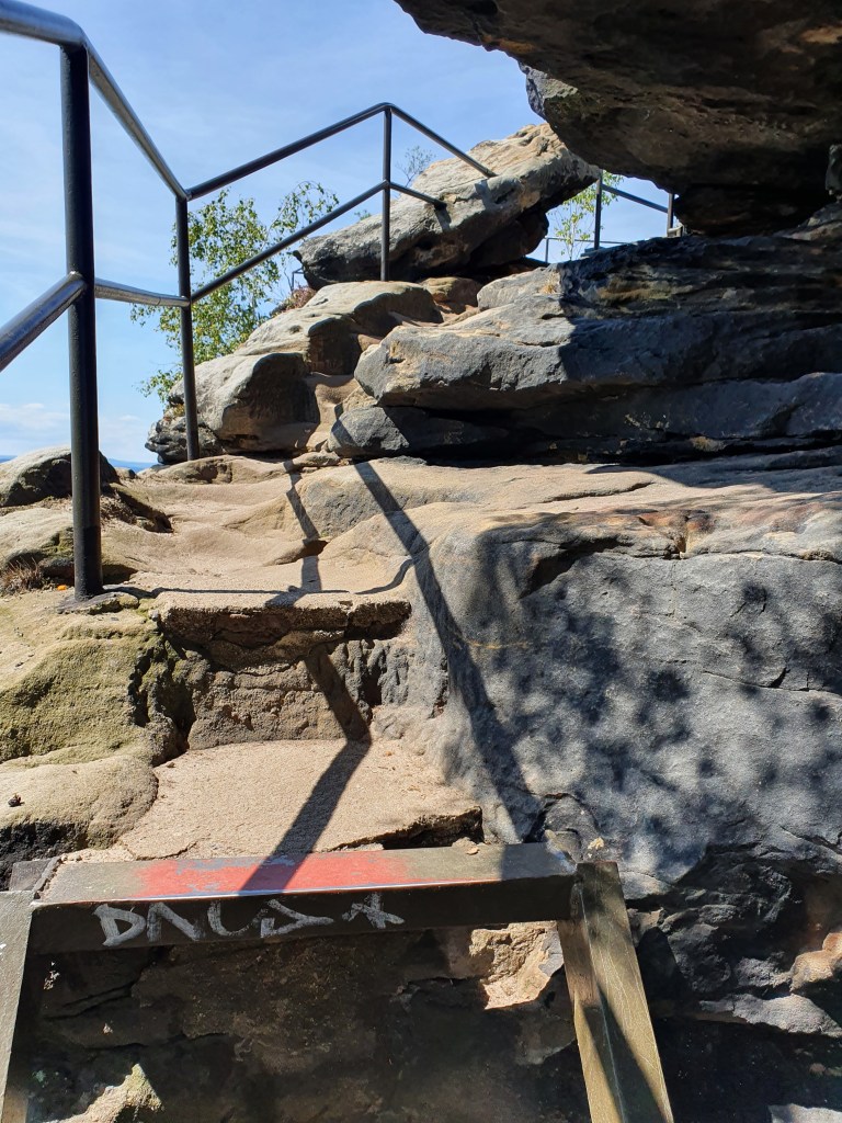 Viel wichtiger und schöner ist jedoch der tolle Rundum-Panoramablick und die massiven Steine des Elbsandsteingebirges. Hier kann man sich nach einem ausgiebigen Fotoshooting einen Platz im Schatten für ein Picknick gönnen.