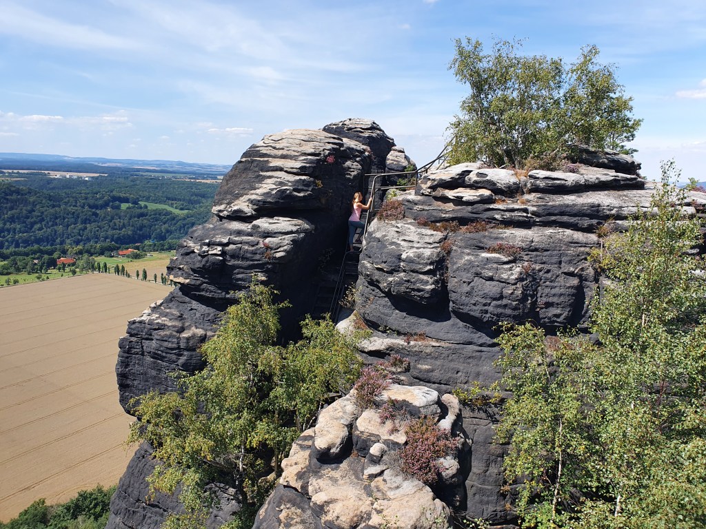 Wenn man nun in Richtung Südroute geht, kommt man noch auf einer besonderen Plattform vorbei. Hier kann man nämlich noch weiter nach oben klettern. Tatsächlich trifft es klettern ganz gut, denn es gibt teilweise nur enge Sprossenleitern. Der Ausblick ist super genial und für einige schwindelerregend. Von hier sieht man übrigens auch die Bastei und durch die bunten Sportoberteile auch die Massen an Leuten, die sich dicht an dicht drängen. Bin ich froh, dass wir zum Lilienstein gewandert sind.