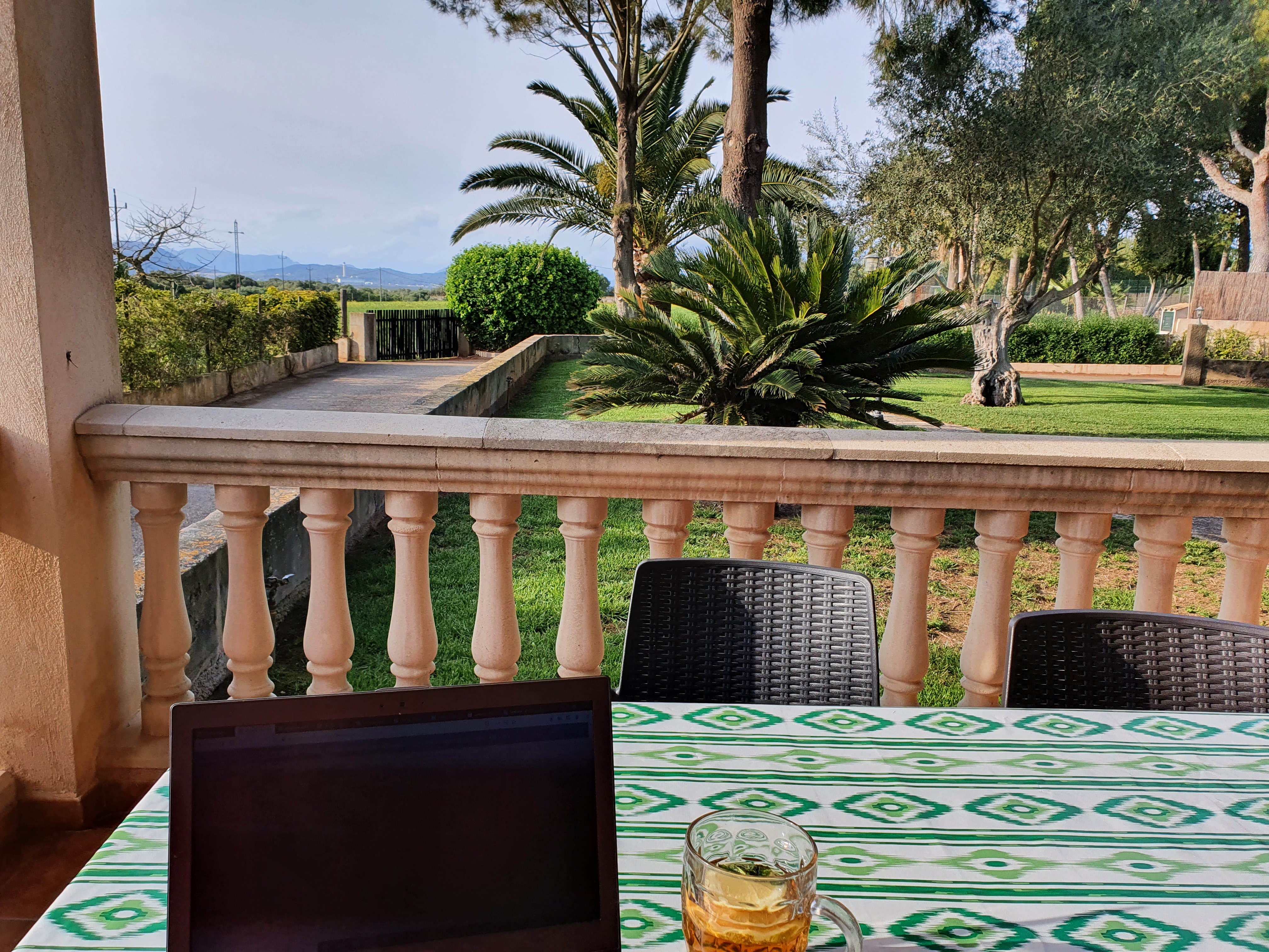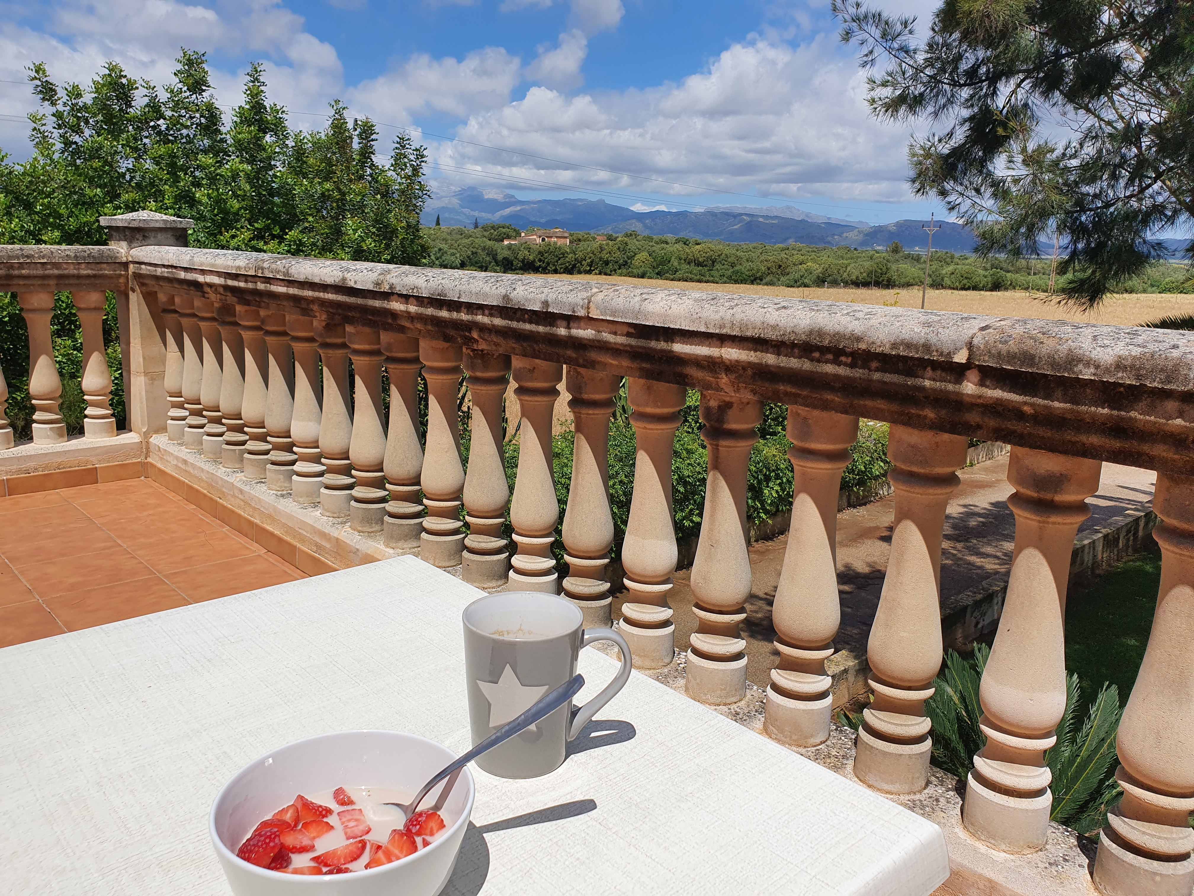 Die Finka ist riesig und traditionell mit einer großen Terrasse ausgestattet, denn in Spanien findet das Leben viel mehr draußen statt, das liebe ich. Wenn es allerdings im Frühling noch frisch ist, sollte man unbedingt einen dicken Pullover mitnehmen, denn viele spanische Unterkünfte haben keine Heizung. (Das Wetter spielt schon verrückt: teilweise konnte ich im Bikini draußen liegen, teilweise musste ich einen Pullover und eine Jacke anziehen, innerhalb von 5 Minuten.)
