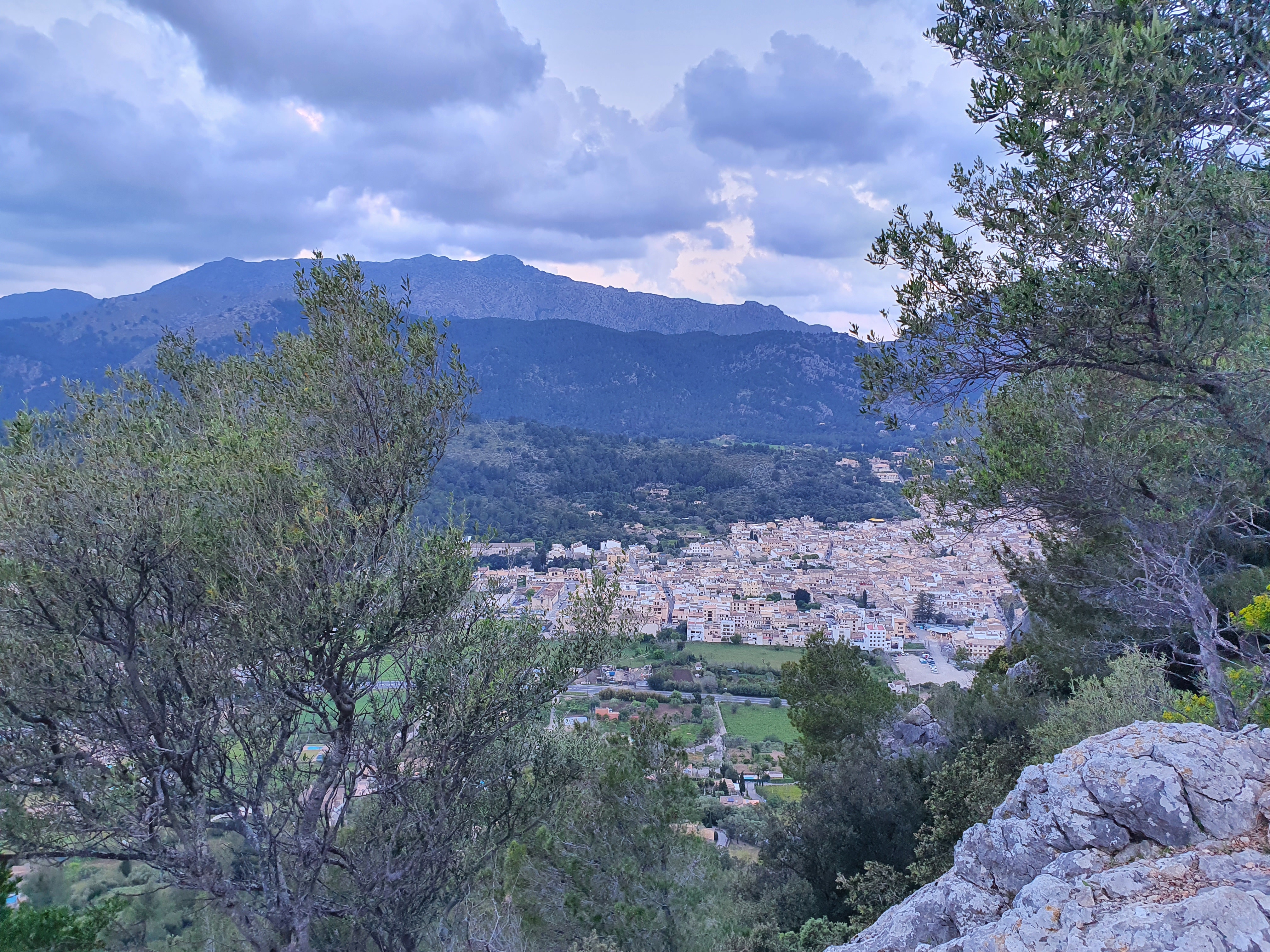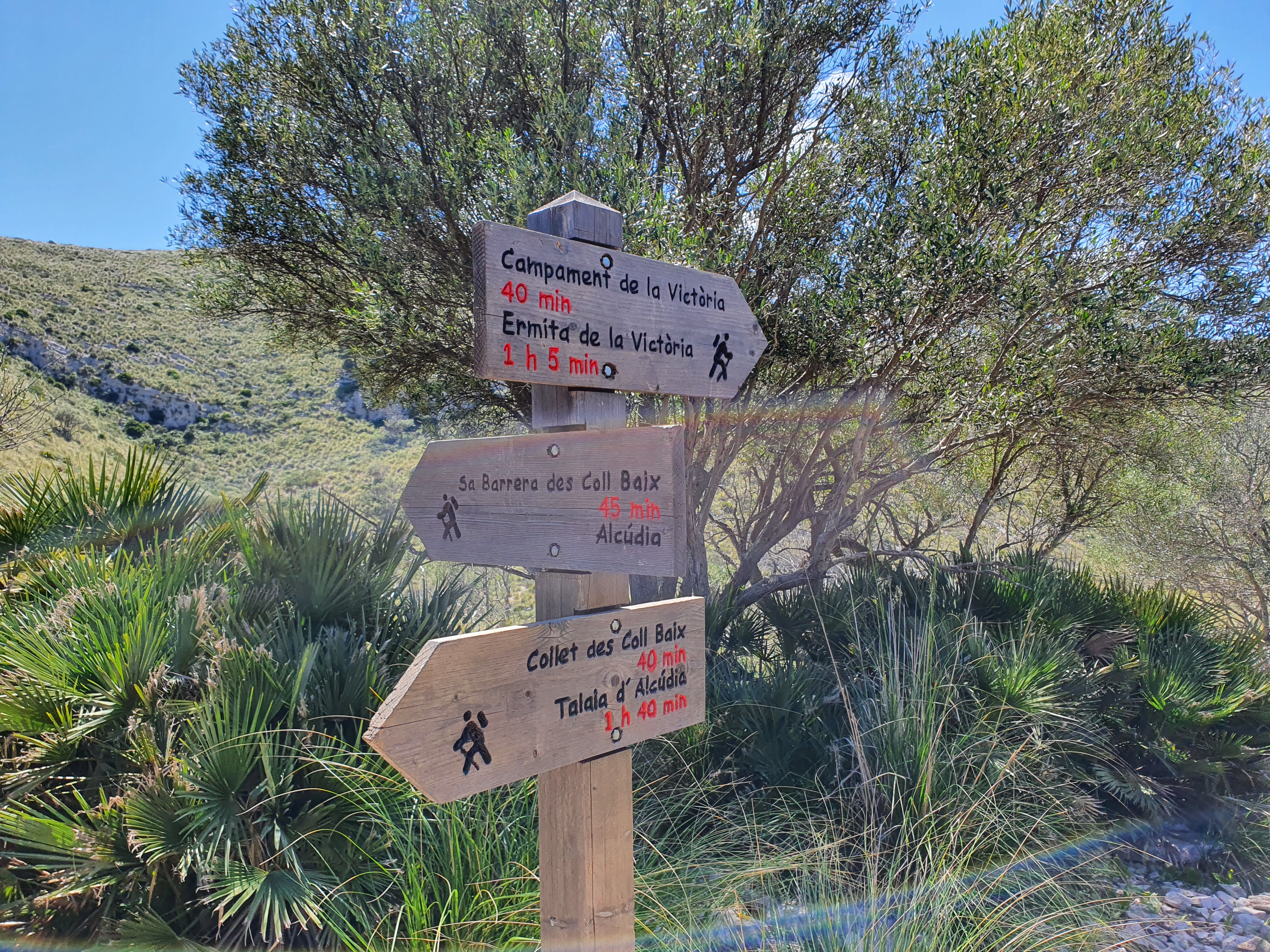 Auf dem Berg kann man sich auf eine der neuen Bänke setzen. Im Sommer kann man sich sicherlich auch auf den Steinen ein Plätzchen suchen. Eine Straße führt ebenfalls zurück nach Porte Pollenca, das dauert ca 12 Minuten und sind 8 Kilometer. Zu Fuß läuft man nur 3,4km und läuft die Abkürzung durch das Tal zwischen den Bergen. Eine schöne kurze Wanderung, die man auch locker mit Kindern bewältigen kann.