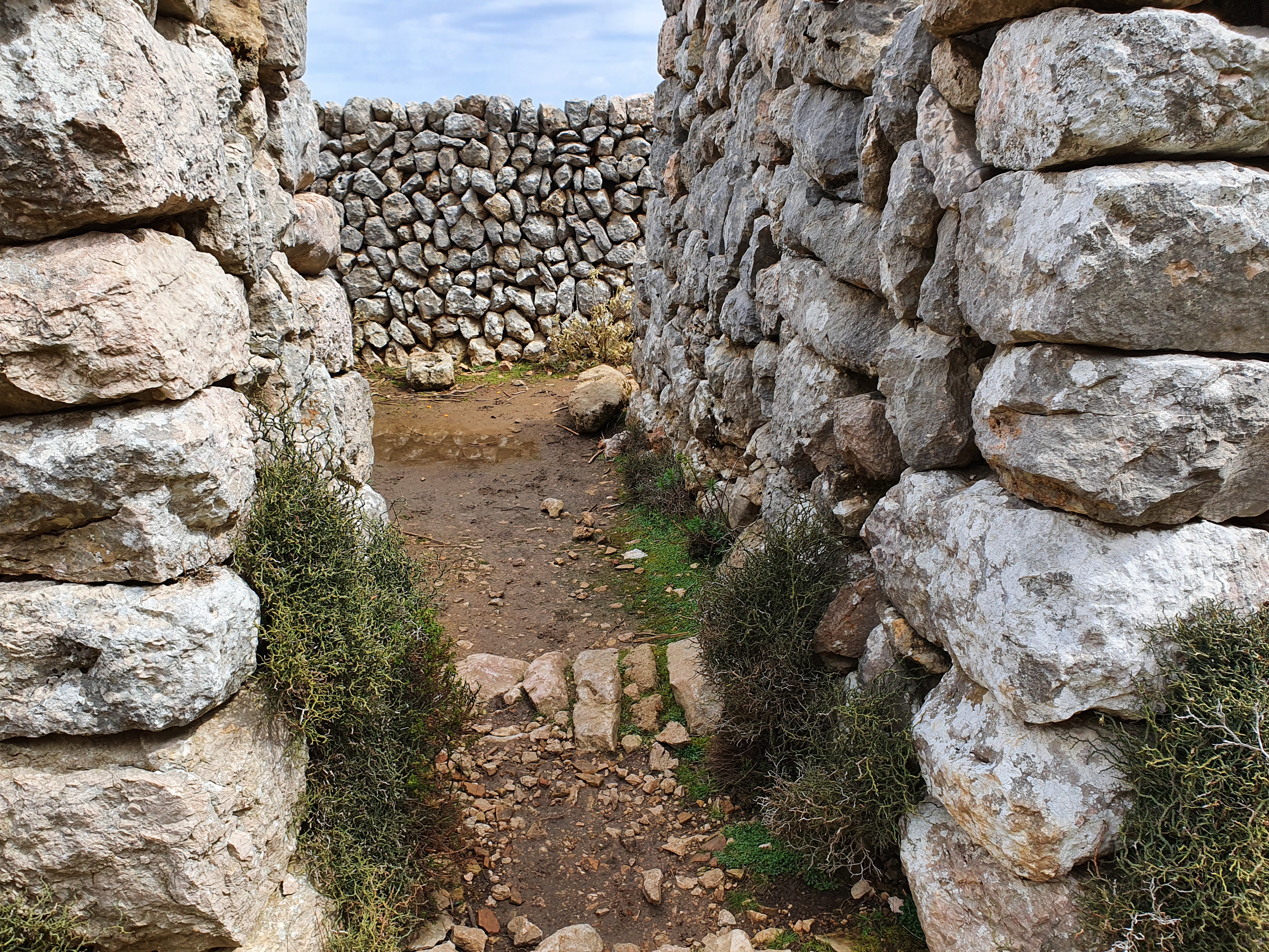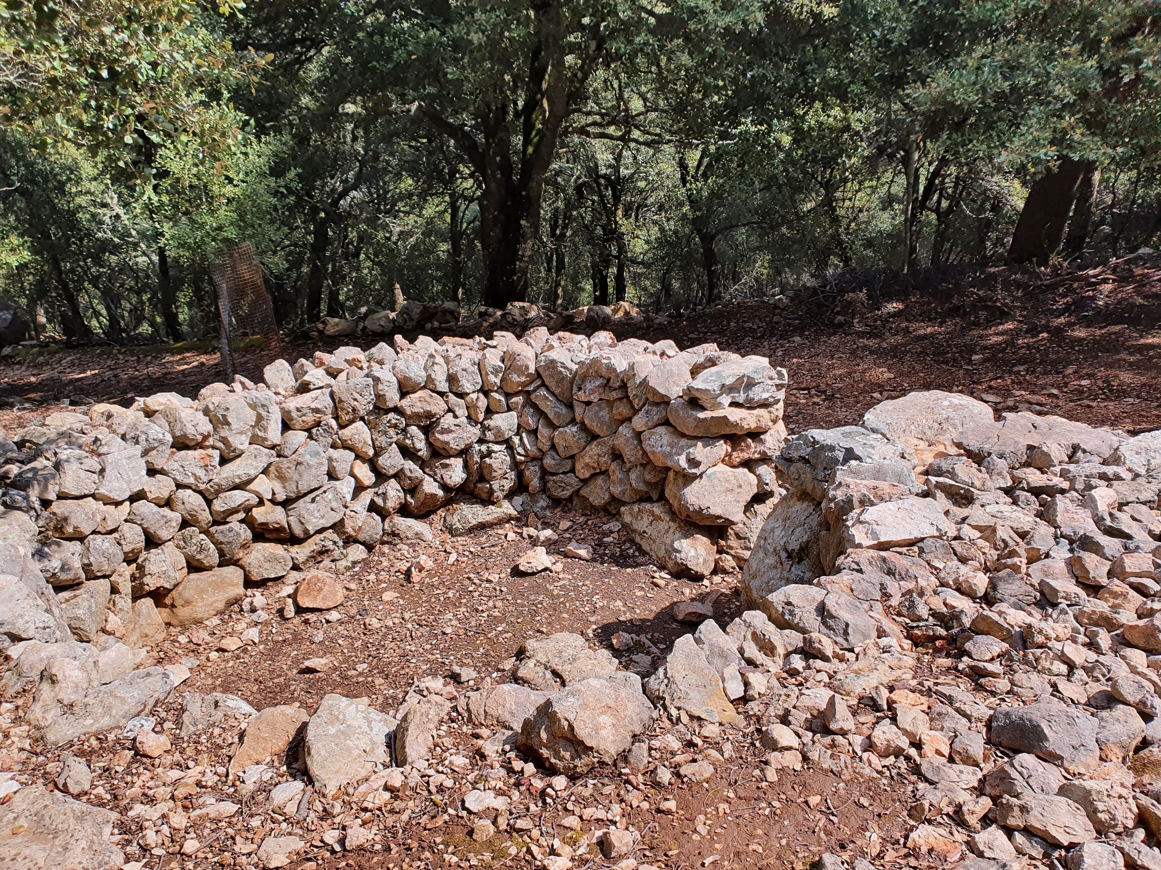 Es geht auf den Pedra en sec, den Sandsteinstufen und größeren Steinen erst flach in den Wald hinein, wird später im Wald etwas steiler. Nach ca 30 Minuten kreuzt man die Bundesstraße Ma10. Man folgt dem Zeichen „GR 221“, bedeutet Grande Route, also große Route, die sich über die ganze Insel zieht und mit der Farbe rot markiert ist. Auf der anderen Seite erreicht man im Wald bereits die ersten Spuren von alter Zivilisation, nämlich die ersten Schneegruben Son Macip. Außerdem finden sich im Wald immer wieder größere runde Flächen, die mit Steinen begrenzt sind und damals als Plätze für Feuer dienten.