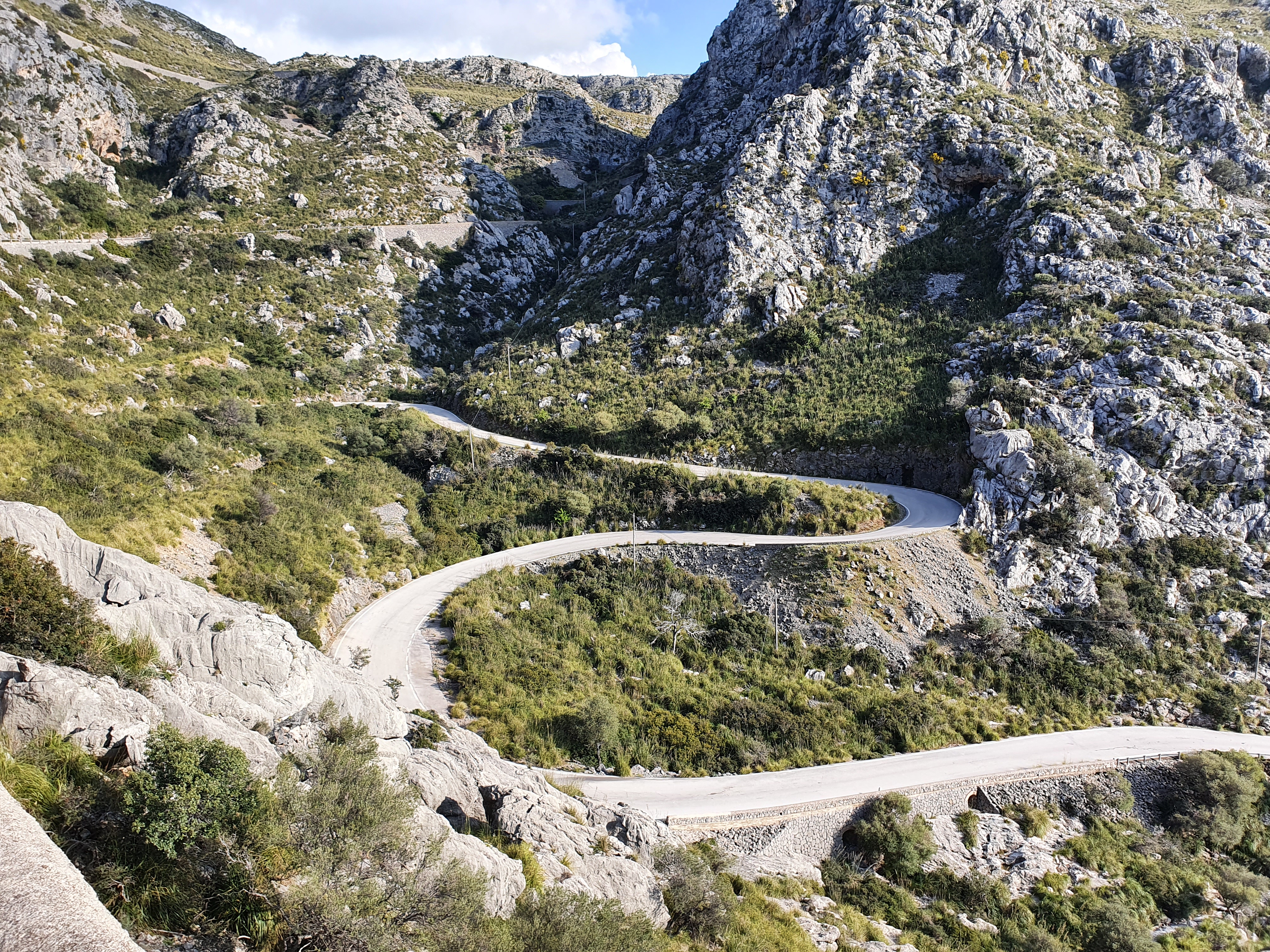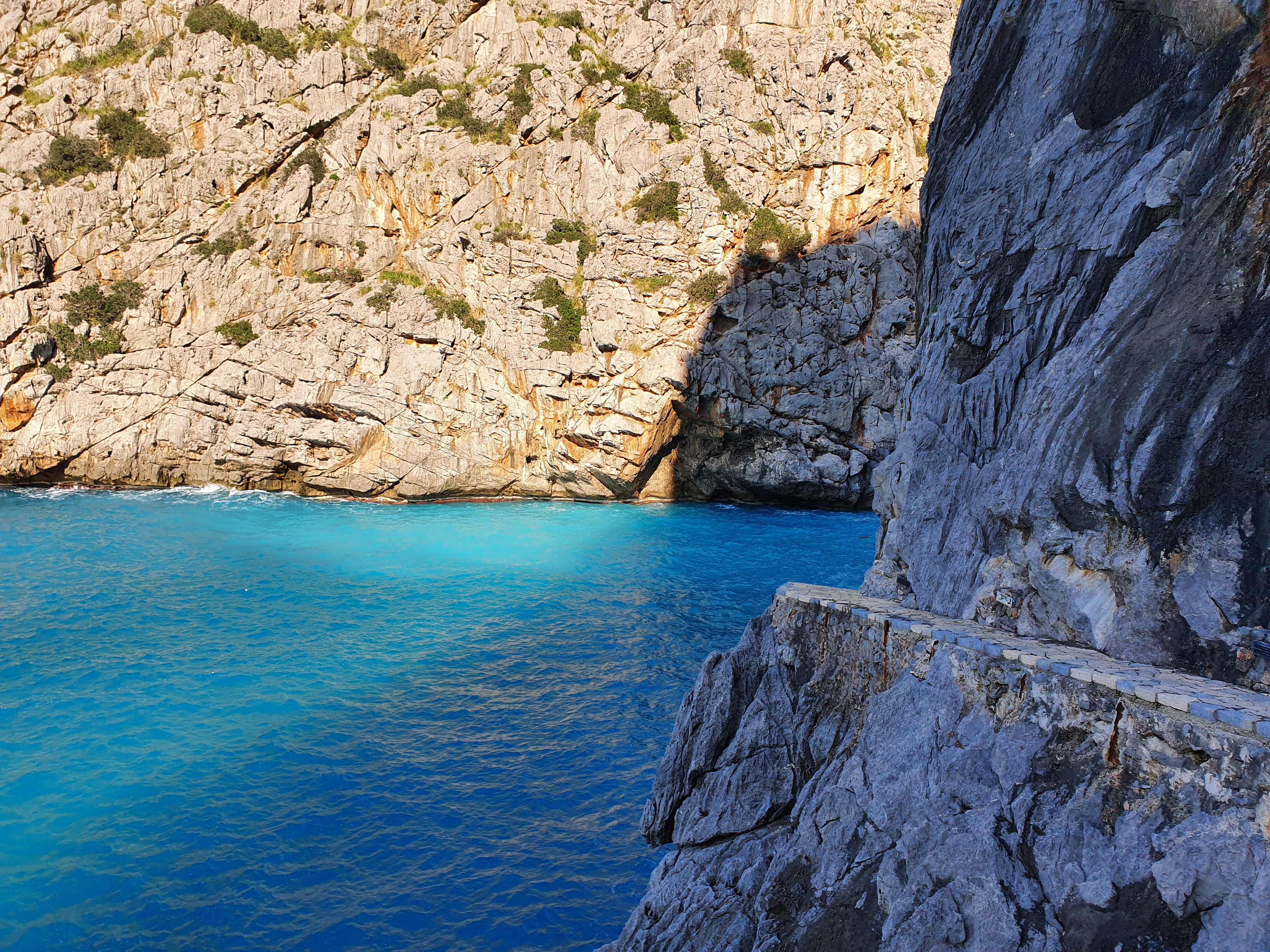 Wer nach diesem Ganztagesprogramm noch mehr Lust auf Abenteuer hat, der kann noch in die Bucht nach Sa Calobra fahren. Die ist nur 12 Kilometer entfernt. Man fährt aber 13 Kilometer nach unten, passiert 12 Haarnadelkurven und 800 Höhenmeter. Für Radfahrer und Motorradfahrer ist es eine der Pisten, die auf der Bucket List stehen. Teilweise sind die Abschnitte eng, man fährt an krassen Abhängen vorbei, die Berge werden abgestützt, oder zumindest Netze gespannt, damit nicht zu viele Steine auf die Fahrbahn rollen. Vor Kurven kann man gut und gern warten, bis der Gegenverkehr passiert ist. Wanderer bezwingen diese Route ebenfalls und stecken insgesamt 9,5 Kilometer Anstieg bzw Abstieg weg. Die Fahrt ist ein einziges Abenteuer und dauert von Lluc aus ca 45 Minuten. Unten in der Bucht angekommen, lässt man das Auto auf dem Parkplatz stehen und kann zum beschaulichen Hafen laufen. Schon der erste Anblick der Bucht und Berge ist gigantisch, doch das war natürlich noch nicht alles. Man passiert einen künstlich angelegten Weg und kann am ersten Fotostopp halten. Danach geht man durch einen Tunnel, der beleuchtet ist. Zu guter letzt läuft man durch einen zweiten Tunnel, in dem das Wasser etwas tropft, also auch hier Vorsicht Rutschgefahr, um dann ins Helle zu laufen und die unglaubliche Größe der Berge zu bestaunen und gleichzeitig dem türkisfarbenen Wasser zu lauschen. Das Wasser wird in einem bestimmten Winkel von der Sonne angestrahlt, dass es aussieht, als ob es leuchten würde. Meereswasser dringt wahrscheinlich bei Flut in das ausgetrocknete Flussbett vom Torrent de Pareis in den geschützten Bereich hinein, wo man auch auf kleinen Steinchen liegen kann und somit befindet sich noch einmal stehendes Gewässer auf der Seite des Steinstrandes. Dieses ist aber nicht zum Baden geeignet. Wenn man noch weiter hinten in das Tal einsteigen würde, könnte man eine intensive Wanderung antreten, die allerdings nur von der anderen Seite (von Escora) ratsam ist und generell nur für sehr geübte Wanderer/Kletterer empfehlenswert ist.