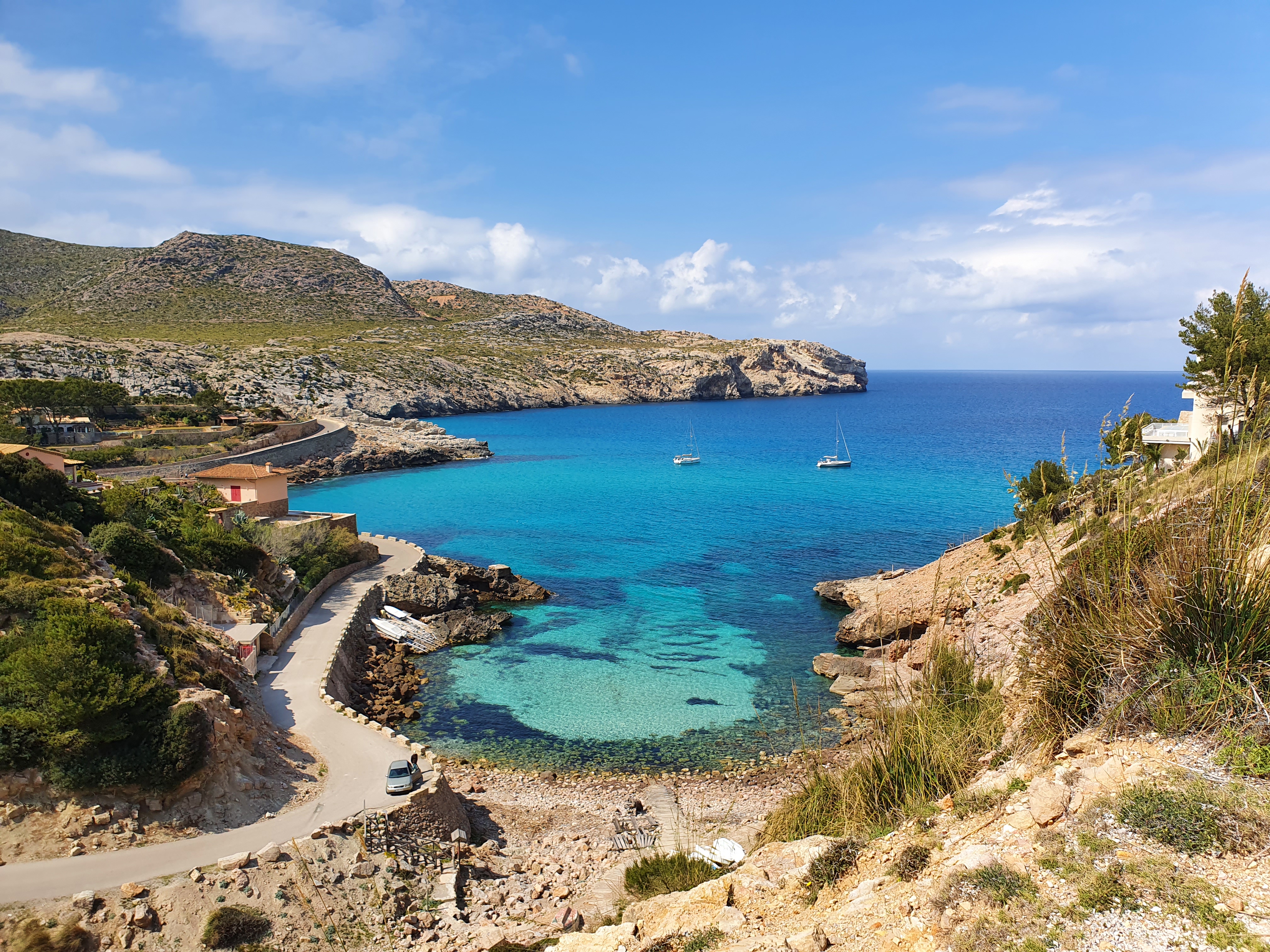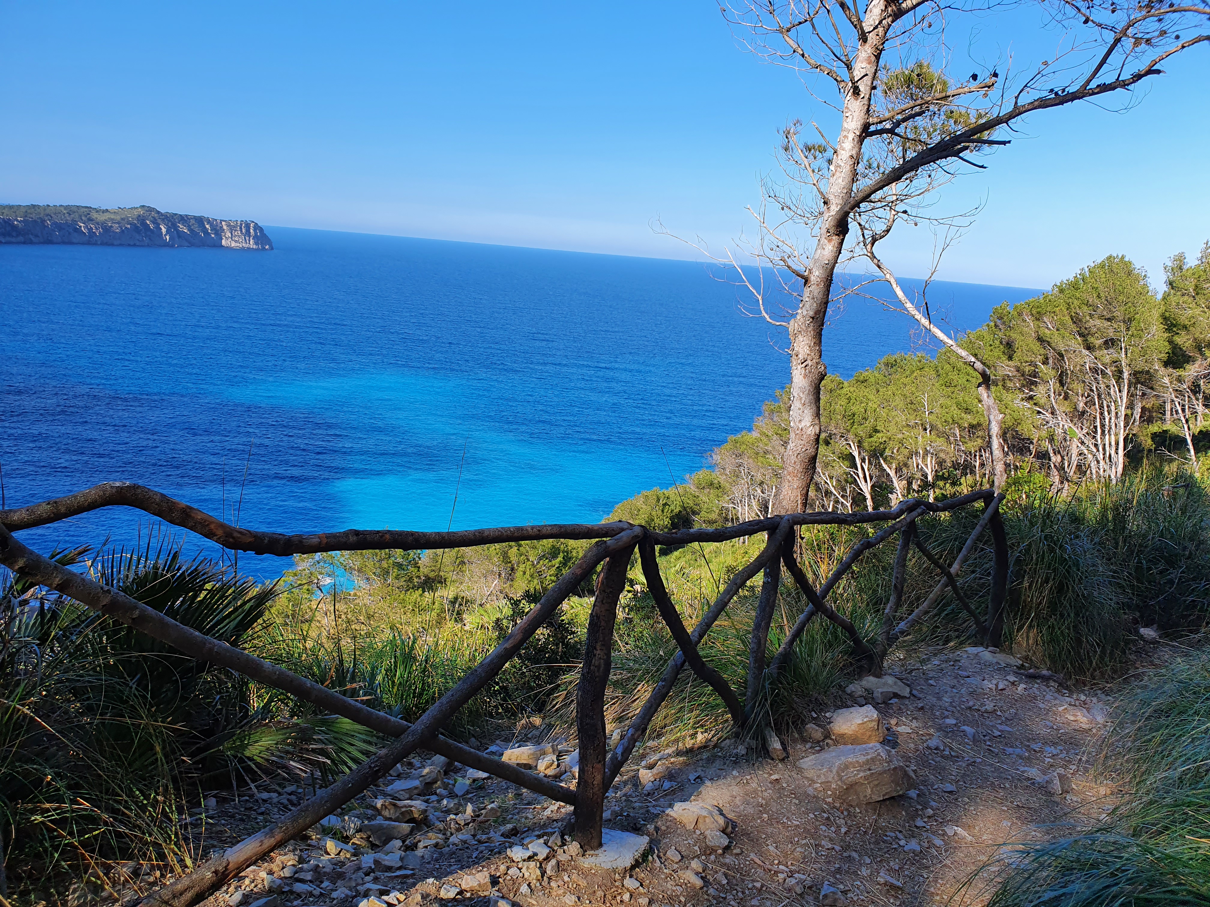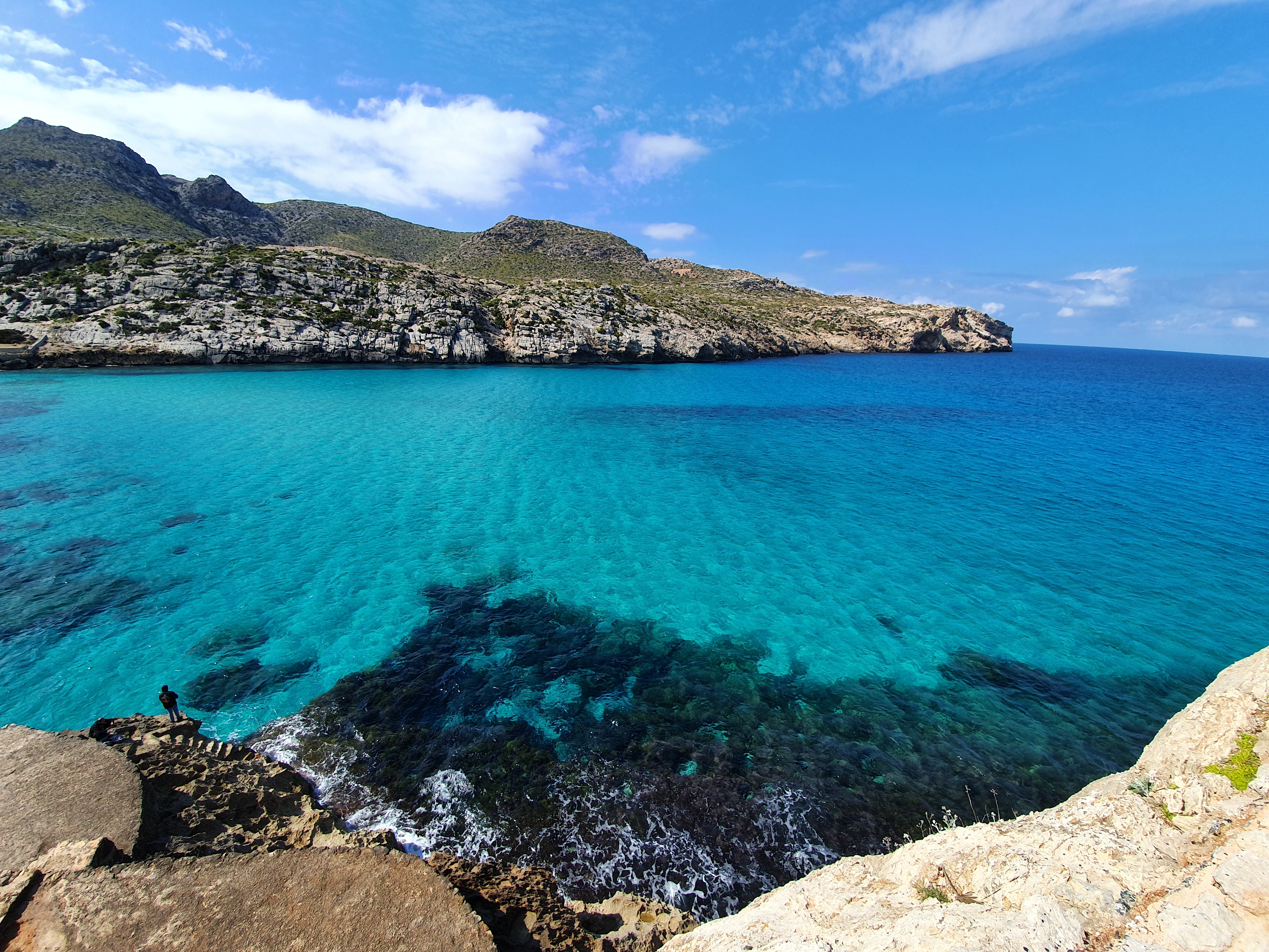 Parkmöglichkeiten gibt es zum Beispiel in Porte de Pollenca beim oder in der Nähe vom Eroski. Von hier aus geht man einfach über die Straße (weg vom Meer in Porte de Pollenca auf die Berge zu), geht durch ein kleines Wohngebiet und kommt ziemlich schnell auf einen Schotterweg, der an sehr schicken Finkas vorbeiführt. Hierbei läuft man in die Einbahnstraße. Dort kreuzt man ein Tor, das verschlossen aussieht, tatsächlich hängt aber nur ein Schloss über dem Zaun oben drüber, ich nehme an, damit Vieh wie Schafe und Ziegen nicht passieren können. Nach etwa 100 Metern geht es langsam etwas steiler den Berg hoch. Der Weg scheint mir ein ausgetrockneter Flusslauf zu sein. Im Rücken hat man nun Porte de Pollenca und läuft in Angesicht des Berges den Weg nach oben. Dieser wird immer schmaler und teilweise steil, sodass man festes Schuhwerk tragen sollte. Nachdem man die Spitze des Hügels passiert hat, läuft man wieder einen Schotterweg entlang. Nach ca 500 Metern sagt Google: „Den Kreisverkehr an der zweiten Ausfahrt verlassen.“ Der Kreisverkehr ist ein runder Straßenbereich mit einem Baum in der Mitte 😉 Hierbei läuft man gerade aus und die geteerte Straße den Berg nach unten. Nach ein paar Minuten erblickt man zum ersten Mal das türkisblaue Wasser und die ersten Boote, die in der Bucht ankern. Immer wieder bleibe ich stehen, um Fotos zu machen und den beruhigenden Blick aufs Wasser zu genießen. Es geht ganz schön steil nach unten und schließlich kommt man in der Bucht „Cala Carbo“ an, gefolgt von der nächsten, etwas größeren Bucht „Cala Molins“. Hier gibt es einen kleinen Kiosk, wo man sich etwas zu essen kaufen kann, ansonsten gibt es nicht viele Dienstleistungen. Die Buchten sind dafür umso schöner. Teilweise recht steinig, aber in der Bucht Cala Molins hat man einen schönen Sandstrand. Wenn man den Berg wieder nach oben läuft, kann man in die nächsten zwei Buchten schauen: „Cala Clara“ und „Cala Barques“, denn jeweils diese zwei Buchten sind von den erst genannten durch den alten Verteidigungsturm Punta de la Torre getrennt. Der Wachturm ist teilweise noch erhalten und bietet alte Steintreppen, die runter zum Wasser führen. Oft kommt mir in Spanien der Gedanke: „So etwas würde man rein sicherheitstechnisch nicht in Deutschland finden.“ Das Wasser glitzert und färbt sich von glasklar und mit Sandboden zu türkis und azurblau, je tiefer es wird.