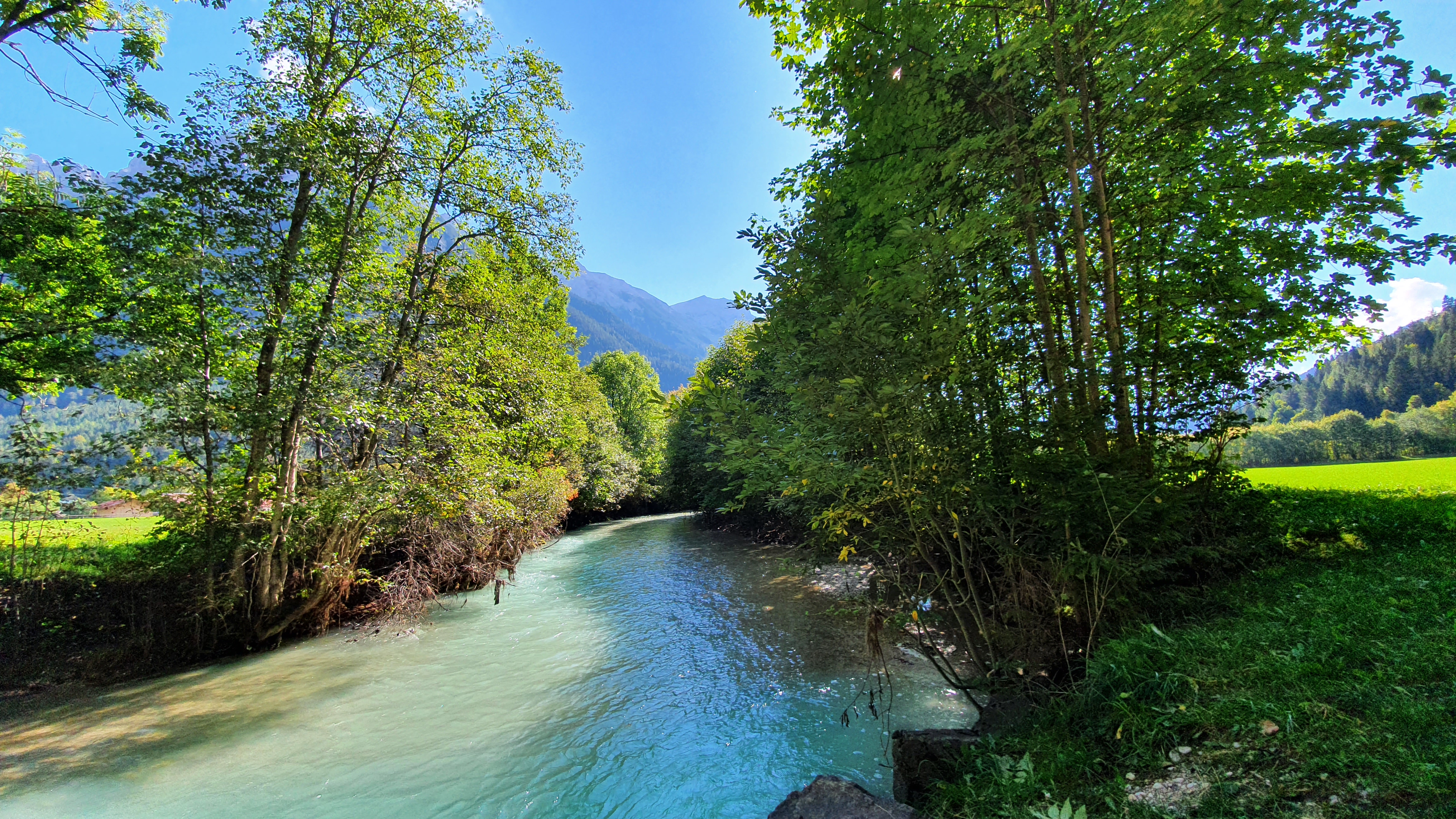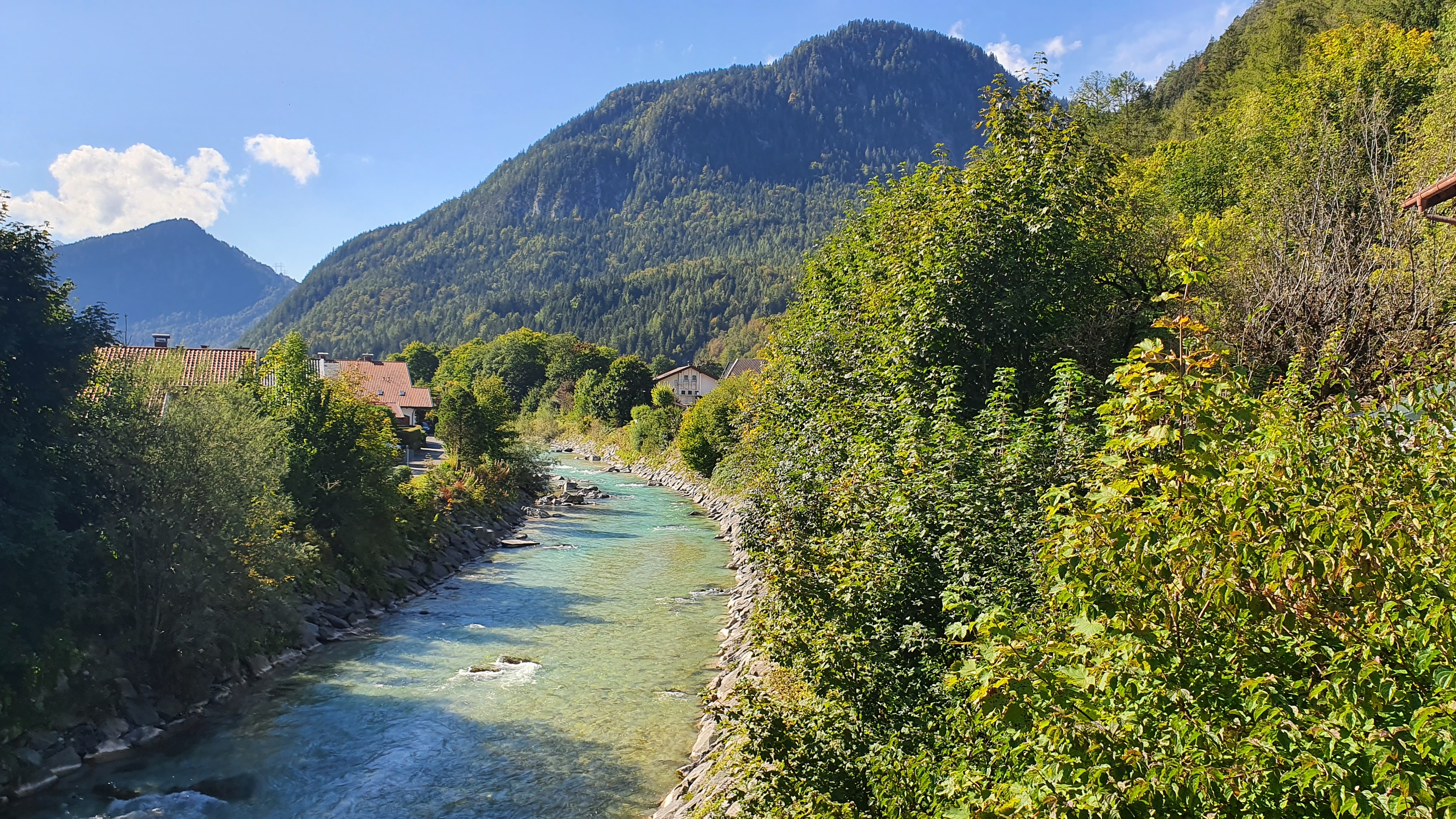Am Ende des Rundwegs kommt man erneut an der Brücke vorbei und läuft dann wieder den steileren Abhang zurück zum Restaurant, vorbei am Fluss und erhascht noch einmal einen gigantischen Blick auf den Karwendel.