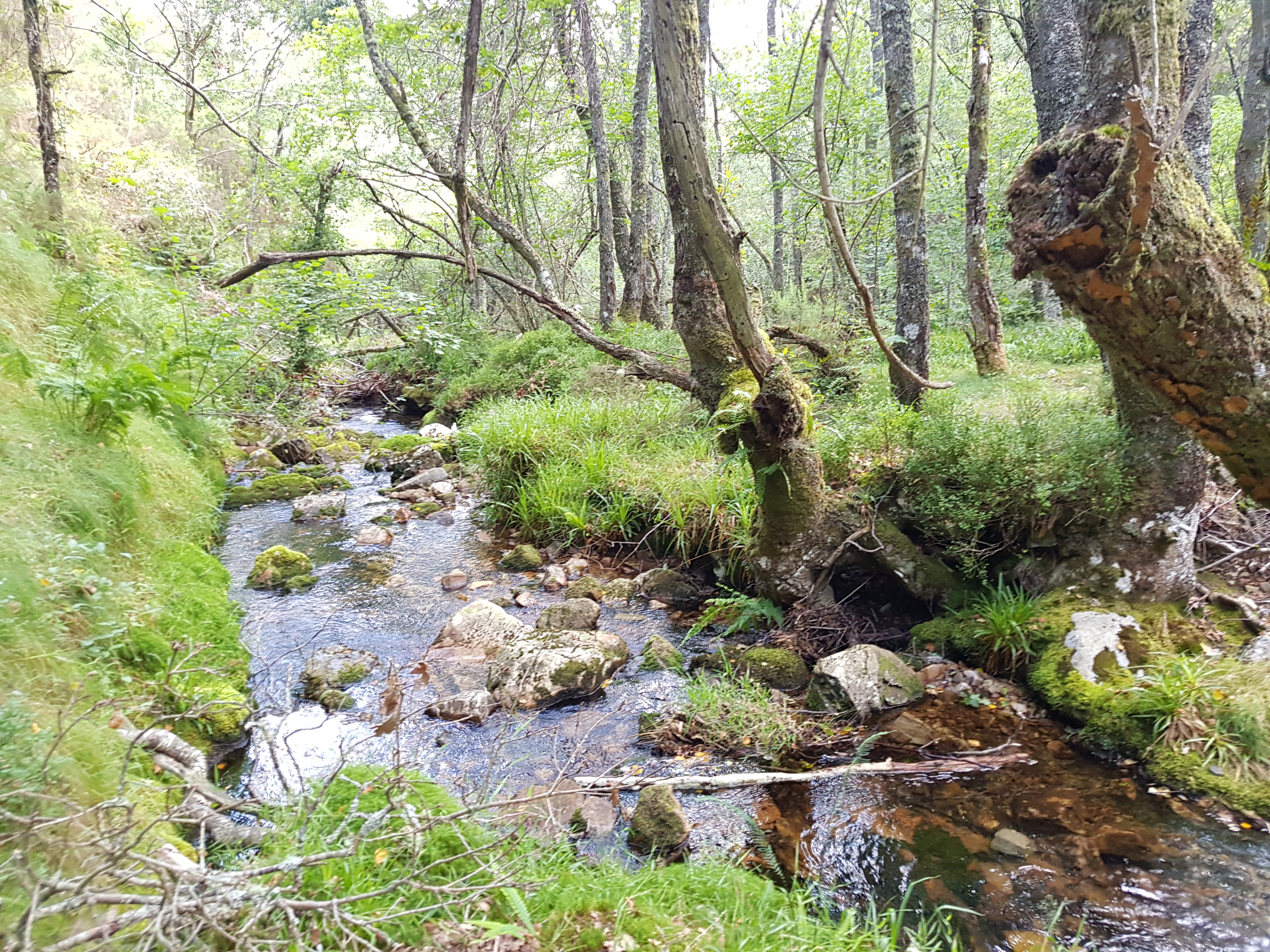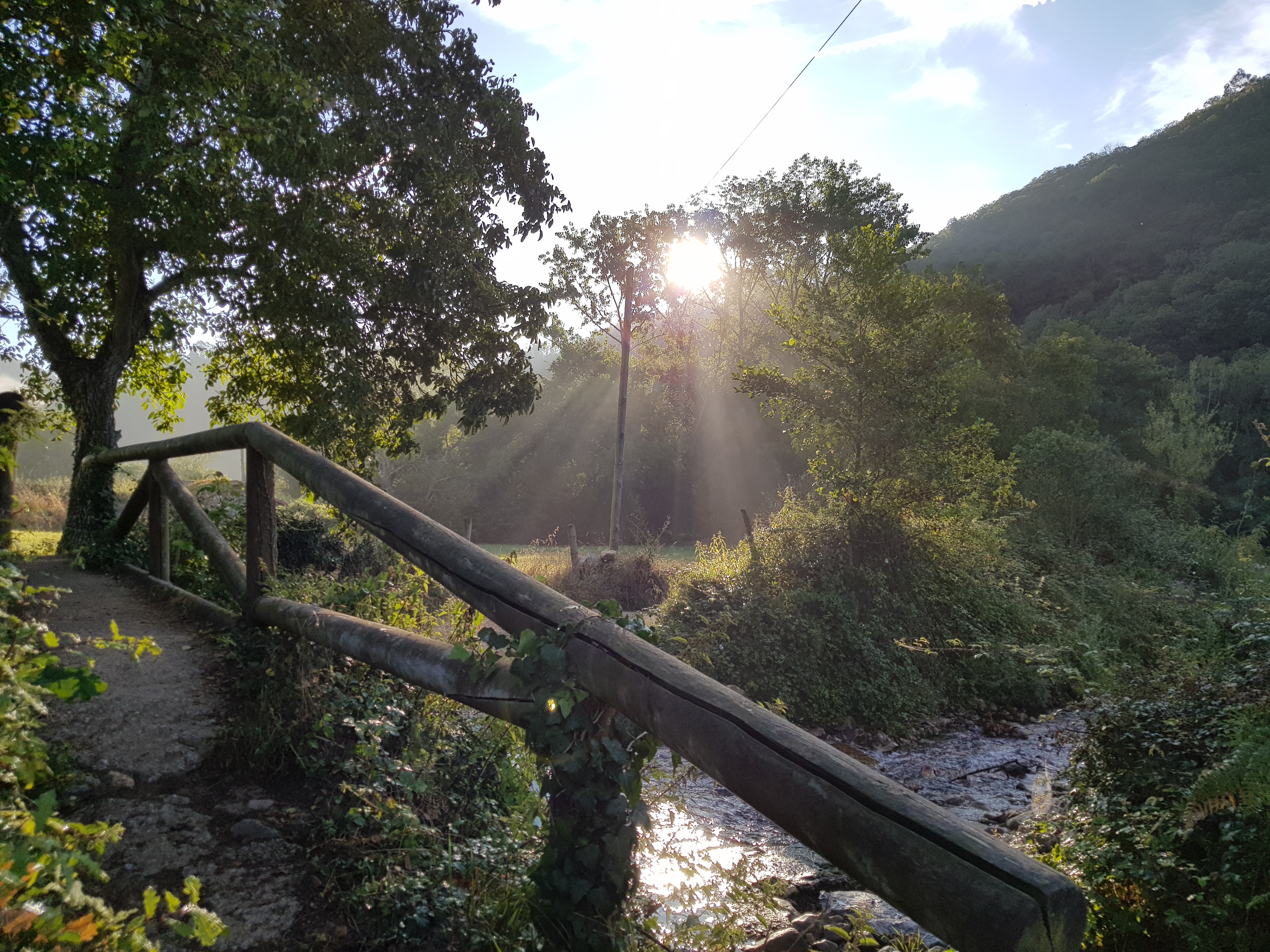 What was that again? The weather can change quickly on the mountain? I start running in the dry and not ten minutes later it hails. Fortunately I can shelter under trees. I continue walking and arrive at the top of the ridge. There is lightning, but fortunately the storm has already moved on. I can see Pasaia and a long coastal route of mountains and sea. After an hour I turn around and walk first on the access road to the weather station. Because downhill it seems to me nevertheless very slippery. At a place, where the horses can not or should not go through, I as a hiker however already, I run again over the grass. No two minutes later it begins to hail again. Also here I place myself again under higher bushes and sit down on a stone near a brook. After a short time it stops hailing and I just walk further down the stream.