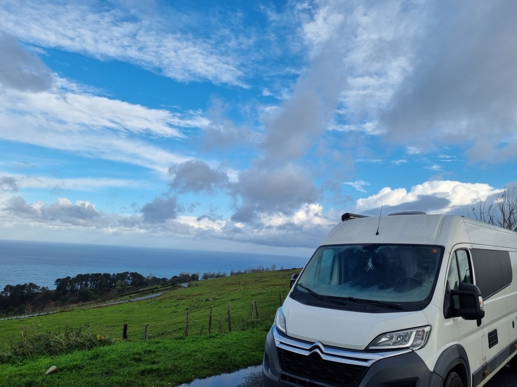 Bei meiner ersten Etappe auf dem Camino del Norte von Irun nach Pasaia, habe ich ein Monument gekreuzt beim Aufgang auf den Berg Jaizkibel. Dort war ein Parkplatz und dort standen viele Wohnmobile. Ich dachte damals: „Wie toll muss es sein, dort zu stehen und den Ausblick zu genießen“. Später auf dem Jakobsweg sah ich ein Mädchen, die mit ihrem Van und Hund unterwegs war und war total fasziniert von ihr. Ich dachte: „Das möchte ich auch, aber das geht nicht, wegen Flynn.“ Nun habe ich einen Van und nehme Flynn mit. Unbedingt wollte ich an diesem Ort stehen. Ich habe ihn gefunden.