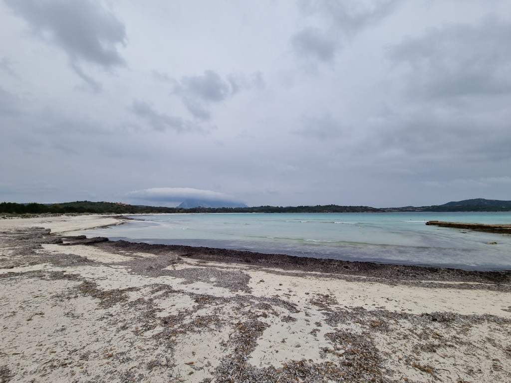 Strand Capo Coda Cavallo, auf der einen Seite (Wetterseite) rau und felsig, auf der anderen Seite ein schöner Sandstrand mit tollem Blick auf die Berge.