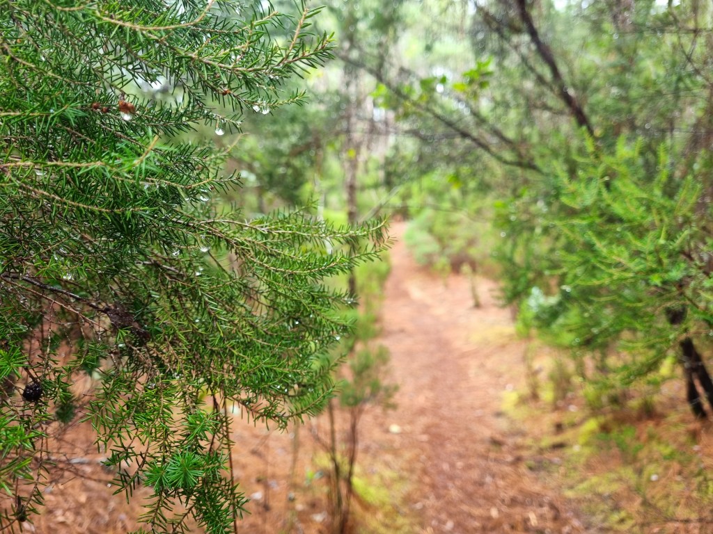 The first part of the path goes through an old forest, evergreen, by the trade winds.