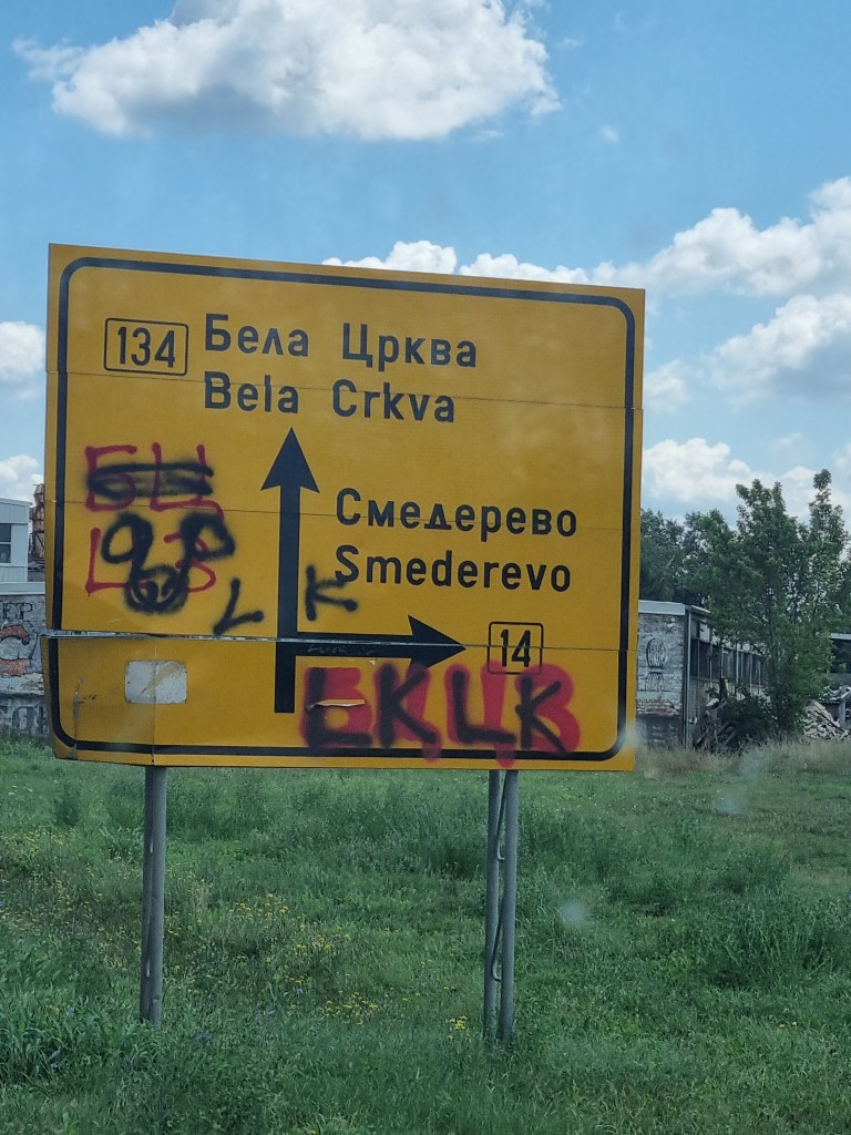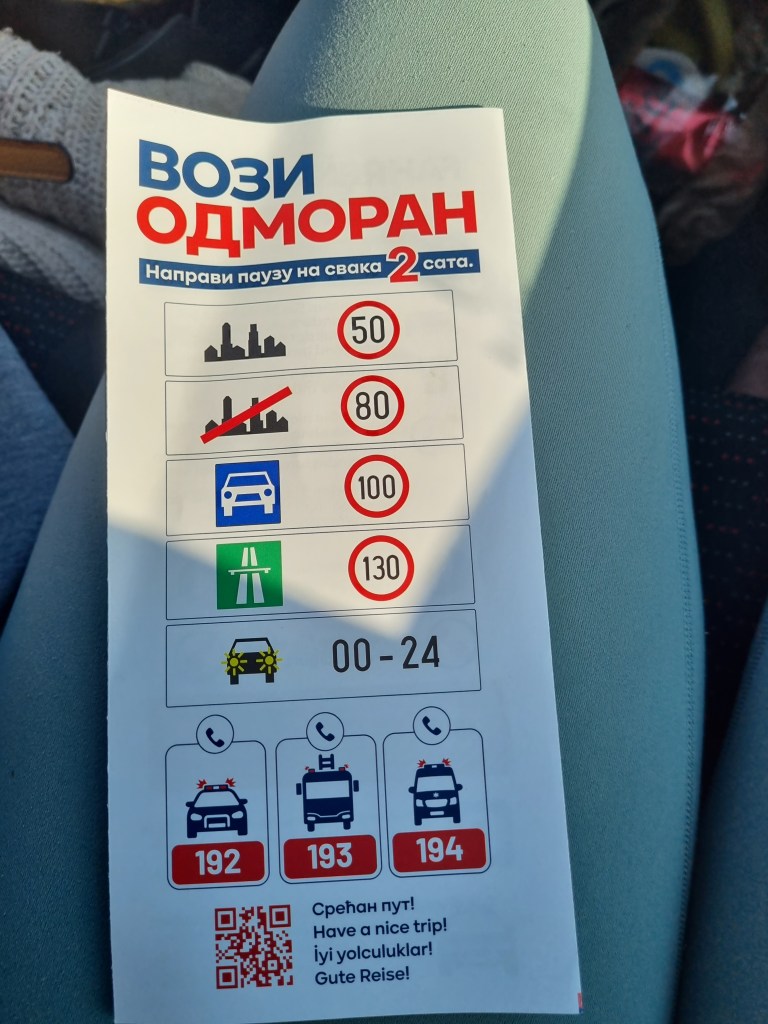 Wir sind an einem ganz kleinen Grenzübergang, der sogar gerade noch Baustelle ist. Es ist ein Schotterweg, vor uns nur ein Auto. Als wir aussteigen, ist es so ruhig, nur die Landesflaggen flattern im Wind. Es erinnert mich an einen Westernfilm. Wir müssen das Auto öffnen, werden gefragt, ob wir etwas zu verzollen haben, was wir verneinen und bekommen netterweise noch ein Dokument in die Hand, wie schnell man fahren darf und wie man sich in Serbien verhalten soll. Das finden wir beide echt nett. Nun haben wir auch einen Stempel in unserem Reisepass mit einem Auto. Denn auf den Stempeln ist immer auch vermerkt, auf welchem Weg (Land also Auto, Luft mit einem Flugzeug, oder See mit einem Schiff, oder gar zu Fuß), man in das Land eingereist ist.
