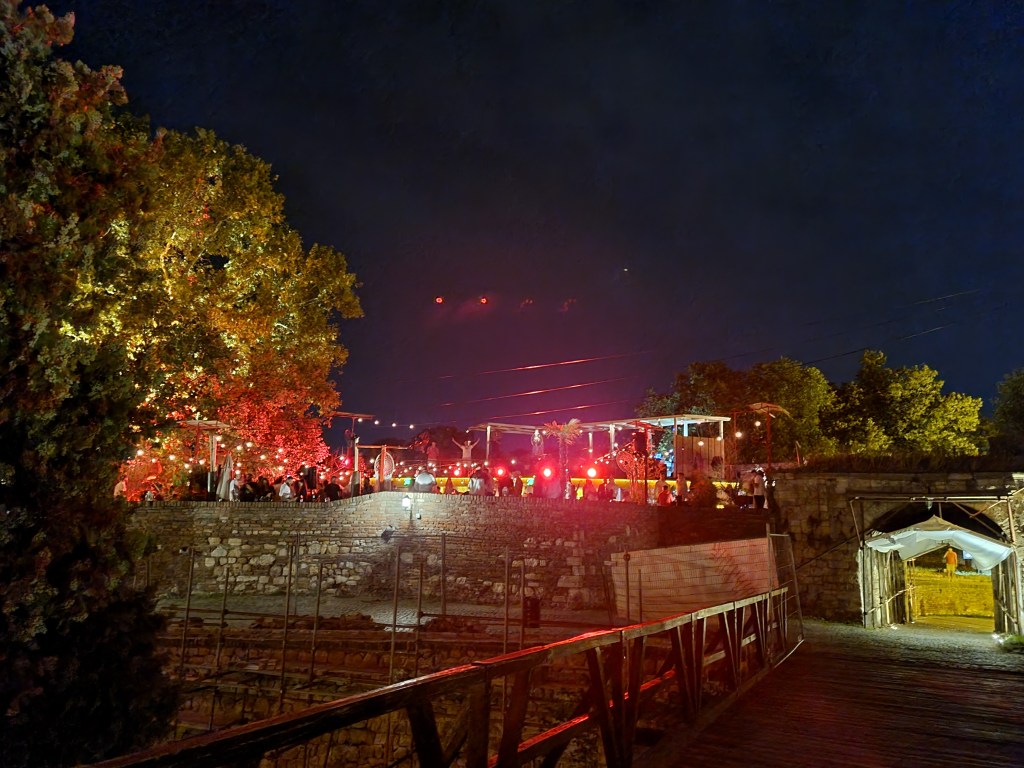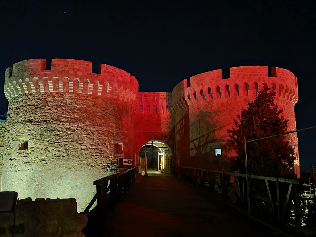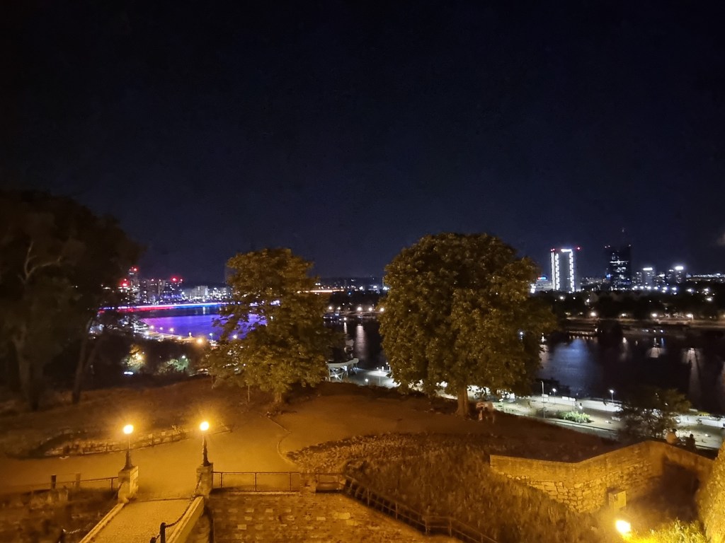 Neben der Tradition, die wir schon geboten bekommen haben, schauen wir uns die Burg an und sind begeistert. Wir kommen erst abends an, doch wir dürfen noch auf das Gelände der Burg. Es ist 24 Stunden geöffnet. Teilweise gibt es oben in einem abgeschlossenen Areal sogar eine Disko. Ansonsten befinden sich viele Menschen in den alten Gemäuern und unter den Bäumen im Park. Von oben haben wir einen herrlichen Blick über die Stadt und die Donaubrücke. Uns fällt auf, dass die Brücke mit neonfarben beleuchtet ist, ebenso wie einige Gebäude. Außerdem dringen von unten vom Fluss verschiedene Musikstile an unser Ohr. Belgrad ist auch als Partystadt bekannt und auf der Donau liegen viele Hausboote, wo Partys gefeiert werden. Die ganze Stadt lebt und das mitten in der Woche. Hier spürt man förmlich das pulsierende Leben. Wir laufen weit über die Burganlage und stellen fest, da wo in Deutschland Absperrungen wären, könnte man unter Umständen fünf Meter tief fallen. Aber hier in Serbien funktioniert das.
