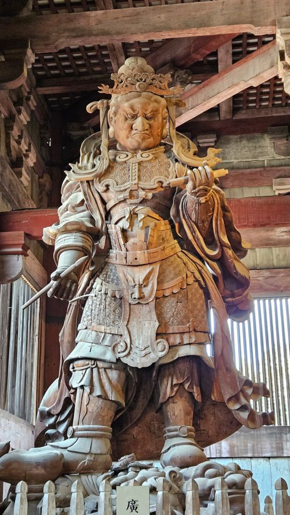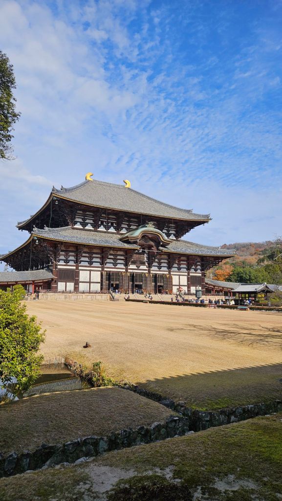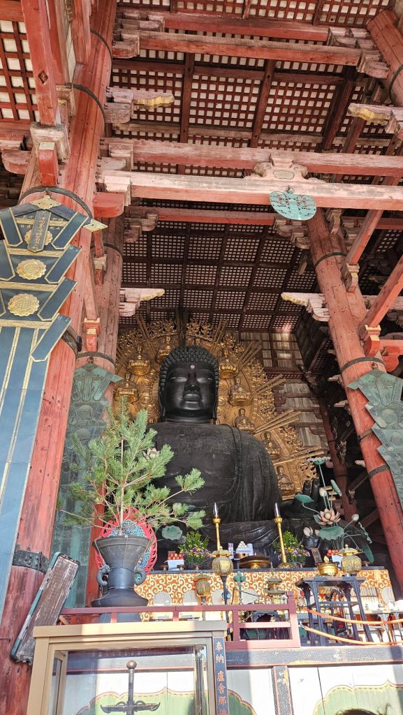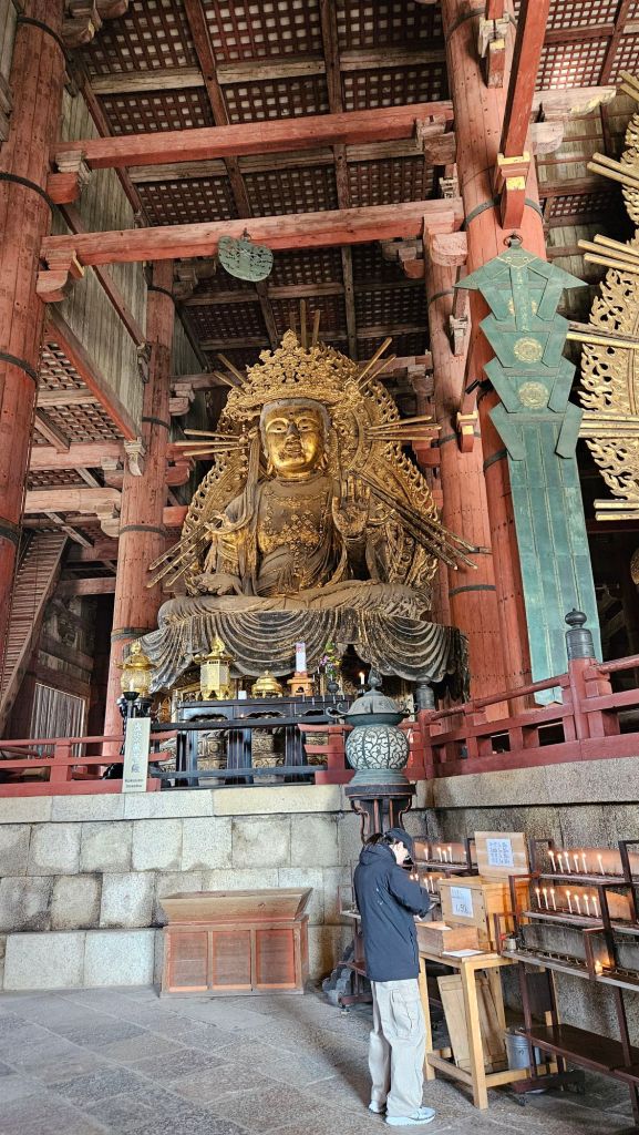 Neben der Rehe bietet Japan auch viele Tempel und Geschichte. Nara diente im 8. Jahrhundert als Hauptstadt Japans und wurde nach dem chinesischen Vorbild Chang’an gestaltet. Diese Ära spiegelt sich in den monumentalen Bauwerken wider, allen voran der Todai-ji-Tempel, Heimat eines der größten Buddha-Statuen der Welt. Der 16 Meter hohe „Große Buddha“ (Daibutsu) zeigt den Wandel von der japanischen Philosophie „Small is beautiful“ hin zu monumentaler Architektur und Kunst. Alle um uns herum waren ebenfalls so beeindruckt von der größe des Tempels und Buddhas.
