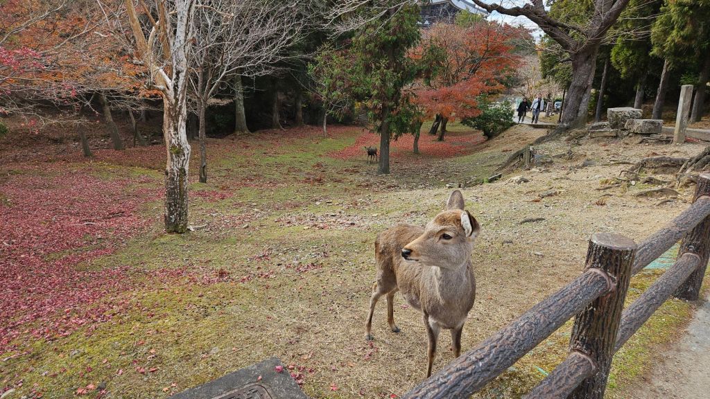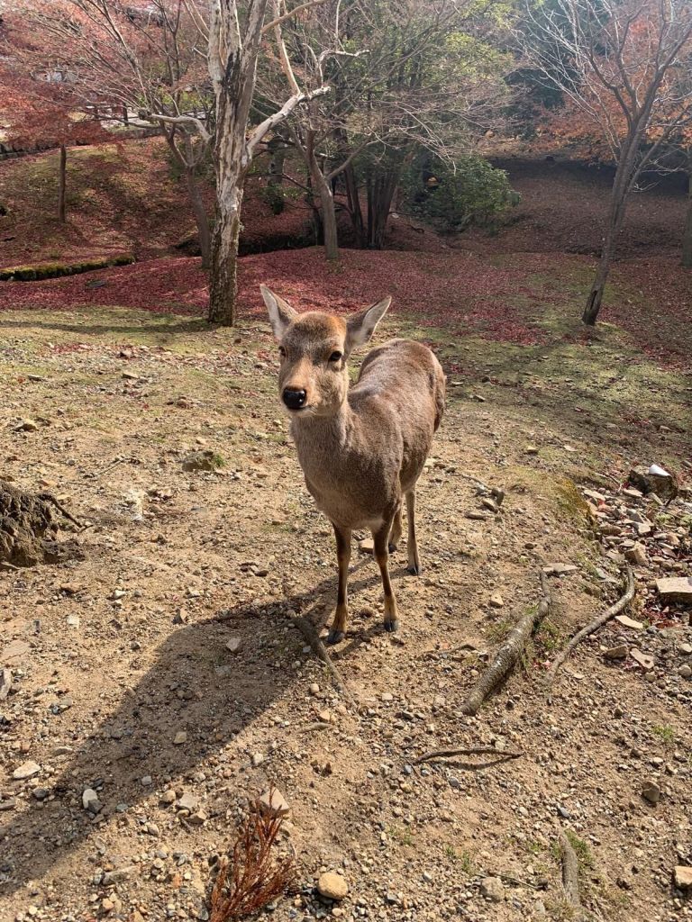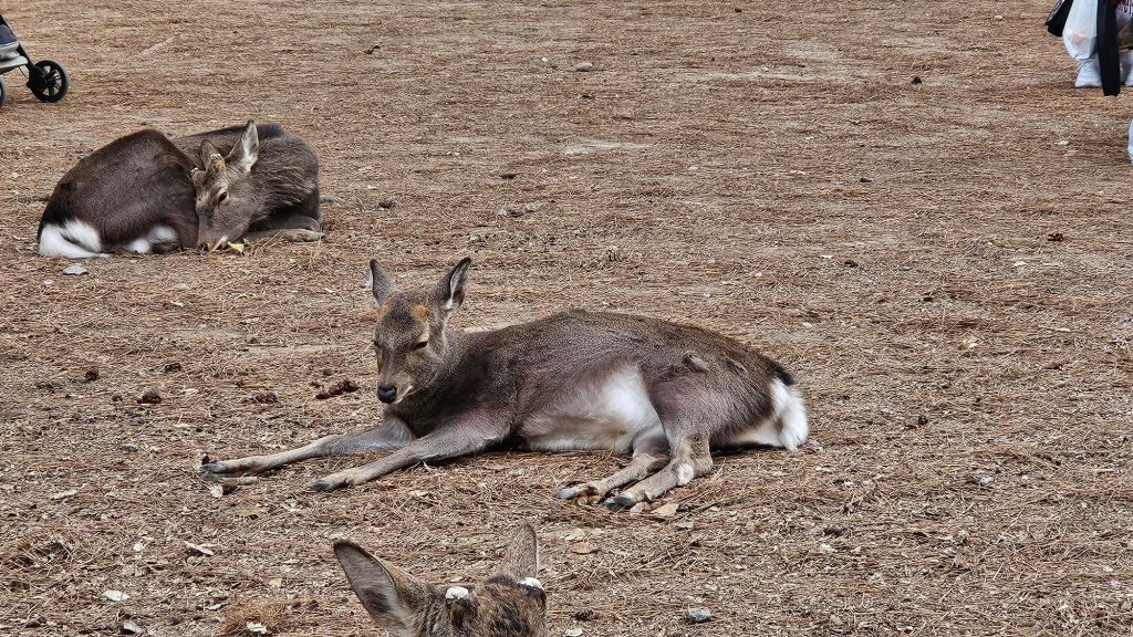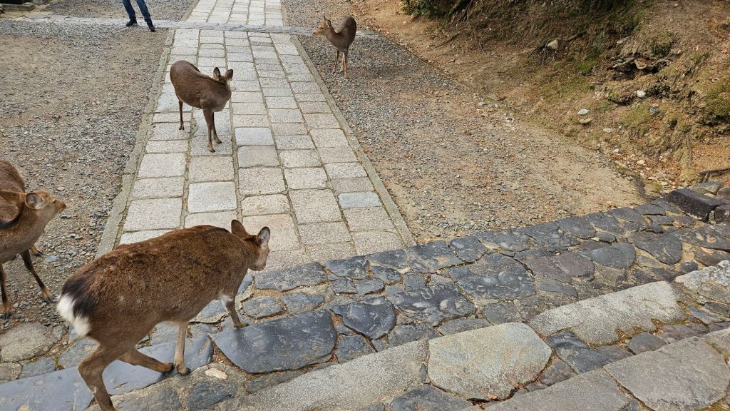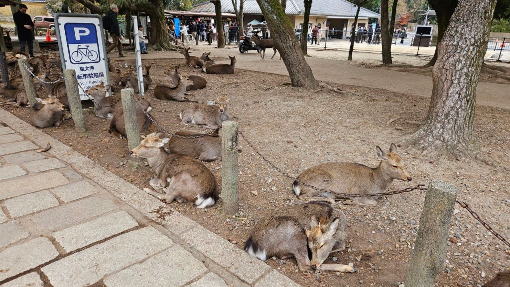 Eine der einzigartigen Attraktionen Naras sind die Rehe, die als heilig gelten und frei durch die Stadt laufen. Nach der Shinto-Tradition sind sie Boten der Götter, weshalb sie überall in den Parks und Tempelarealen willkommen sind. Schon als wir aus der Bahn ausgestiegen sind, blieben wir nach zwei Minuten stehen. Aber es kommen noch so viele Rehe mehr, die Menschen gewohnt sind. Besucher können spezielle Cracker kaufen, um die zutraulichen Tiere zu füttern. Doch Vorsicht: Die Rehe sind immernoch wilde Tiere und gerade vor jungen Hirschen wird immer wieder gewarnt!!! Es gibt Angriffe von Rehen auf Menschen – es sind eben wilde Tiere.