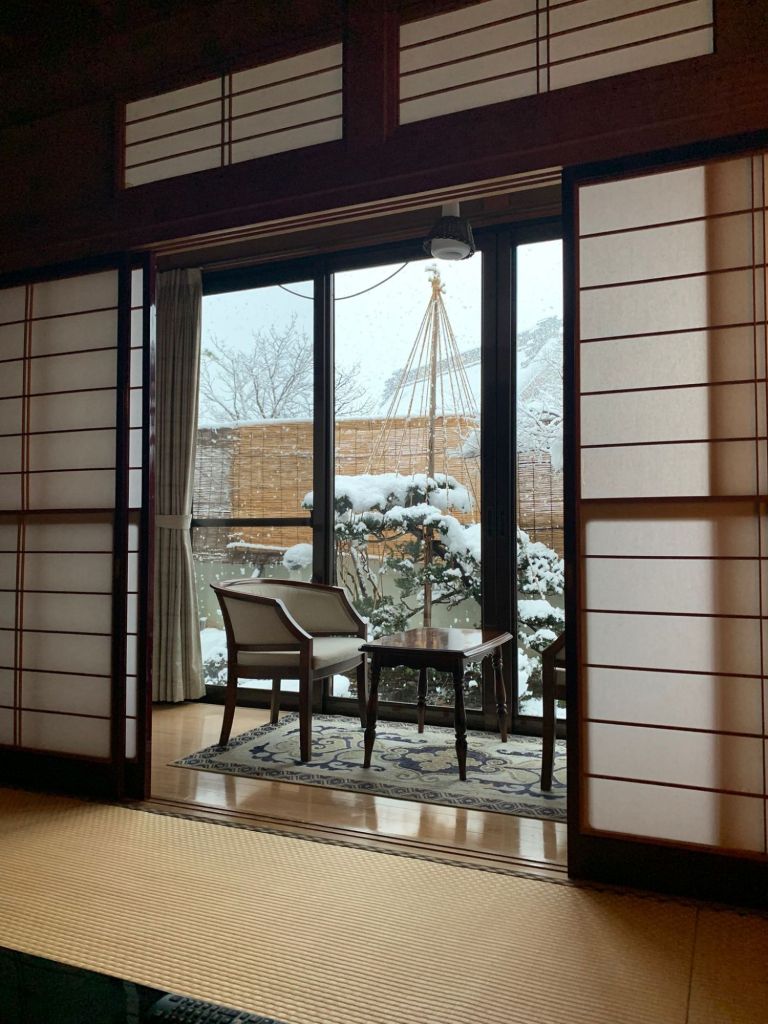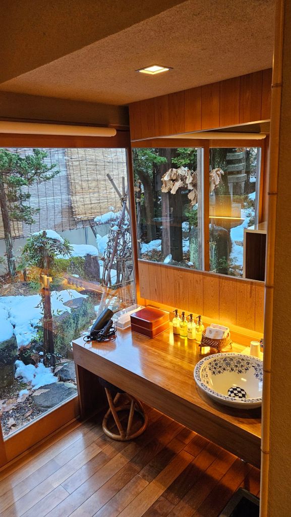 Die Unterkunft, geführt von einer Familie in der achten Generation, war wie ein Schritt zurück in die Vergangenheit. Das traditionelle Haus mit Tatami-Matten, bodentiefen Fenstern zum Garten und einem privaten Onsen war einfach zauberhaft. Hier konnten wir zum ersten Mal gemeinsam ein heißes Bad nehmen, denn ansonsten sind bei die Onsen streng nach Geschlechtern getrennt – eine Erfahrung, die uns lange in Erinnerung bleiben wird.