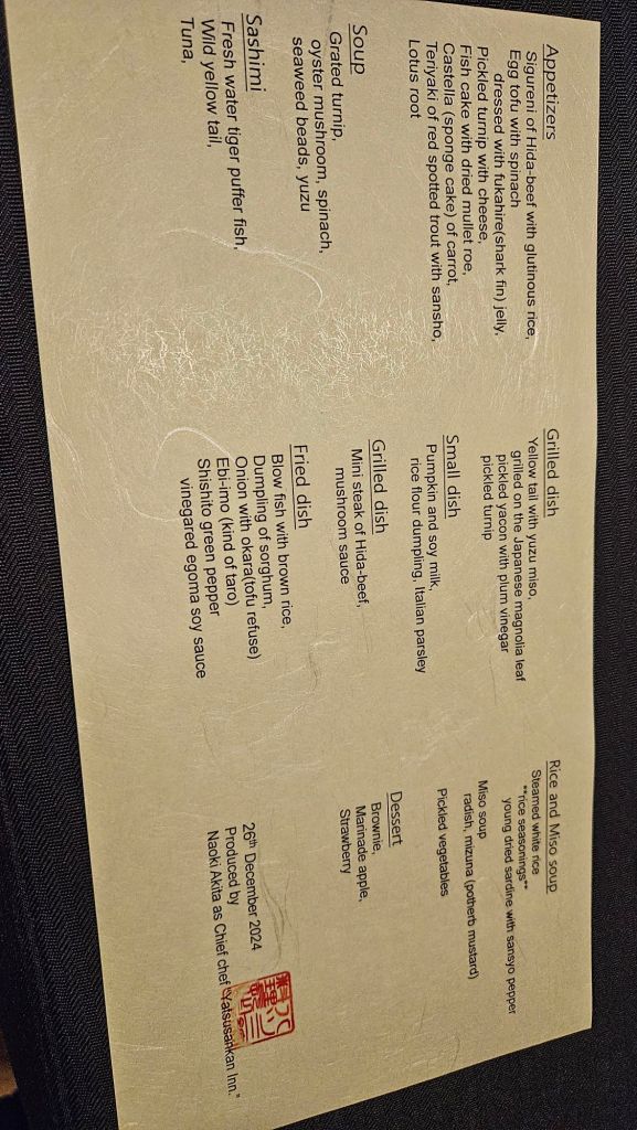 Our accommodation, run by a family in its eighth generation, felt like a step back in time. The traditional house, complete with tatami mats, floor-to-ceiling windows overlooking the garden, and a private onsen, was enchanting. Here, we shared a hot bath for the first time—a memory we’ll treasure. Dinner was a traditional kaiseki meal, a true culinary highlight.