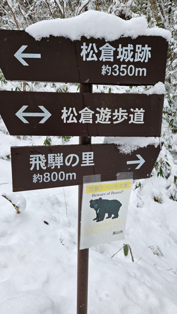 Unfortunately, the Squirrel Park was closed during our visit due to breeding season. We ended up hiking 2.5 km uphill in the snow in vain. Instead, we followed another road closed to cars but marked with footprints. Later, we saw signs warning of bears in the area. Bears here don’t hibernate but enter a state of winter dormancy, waking intermittently. Though we didn’t encounter any, I kept glancing over my shoulder, just in case one was following us!