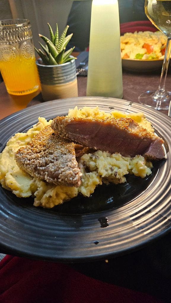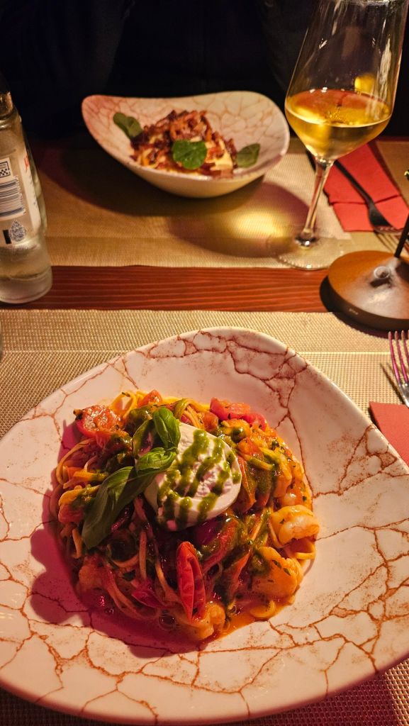 Der Platz beinhaltet ein Restaurant, was gut, aber für Camping relativ preisintensiv ist. Für den Octopus Salat zahle ich 17€.
