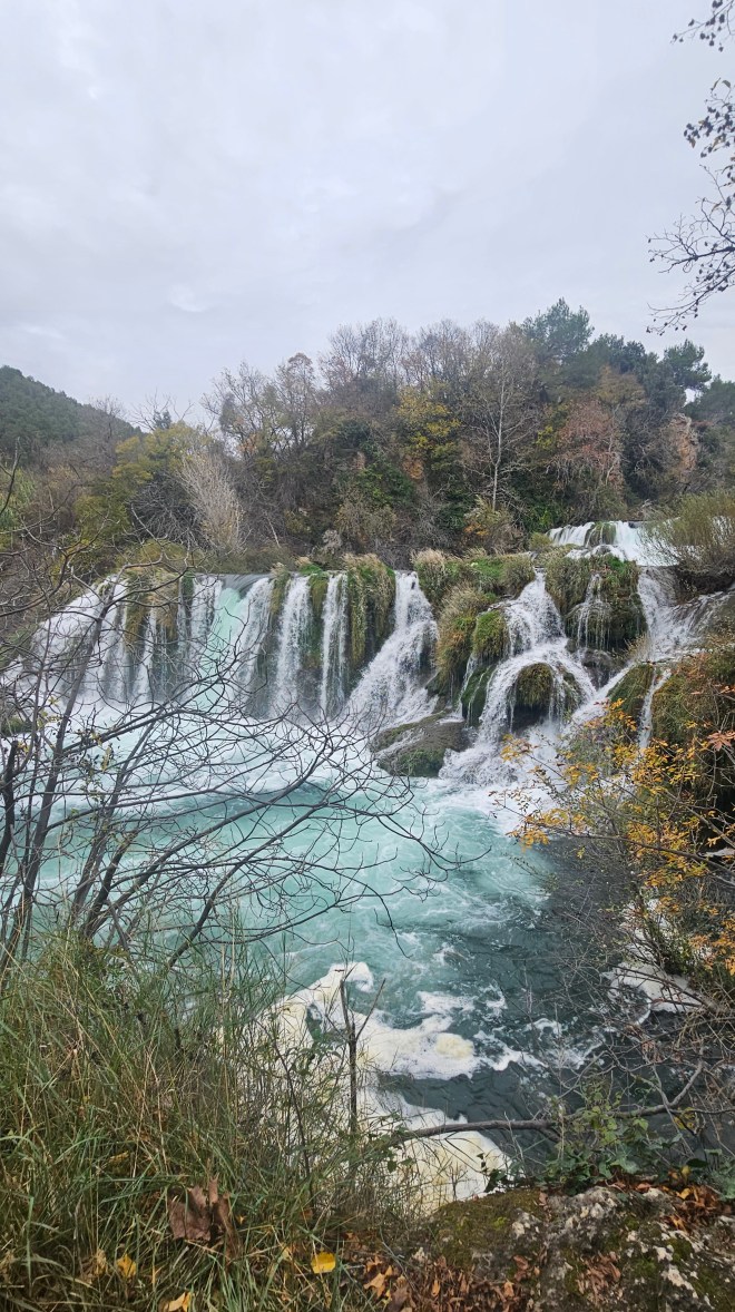 Auf Grund des kalten Wetters um den Gefrierpunkt, entscheiden wir uns nicht für die Plitvicer Seen, sondern für den Park Krka. Hier gibt es einen großen Parkplatz, wo man das eigene Auto stehen lassen muß. Entweder fährt man mit einem Shuttle Taxi runter zu den Wasserfällen oder wandert, wie wir.